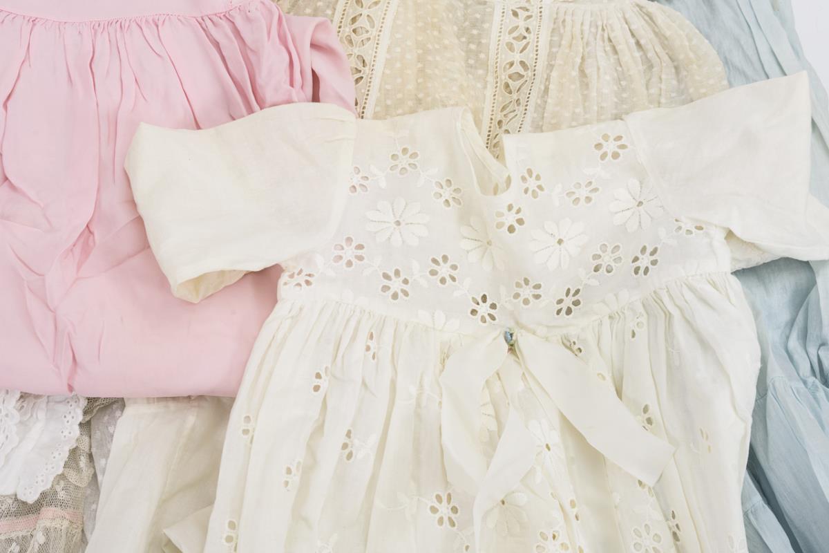 Various delicate, mostly white christening gowns, including 1x pink and 1x light blue. In addition various artificial flower bouquets and 1 hair wreath. Signs of age.