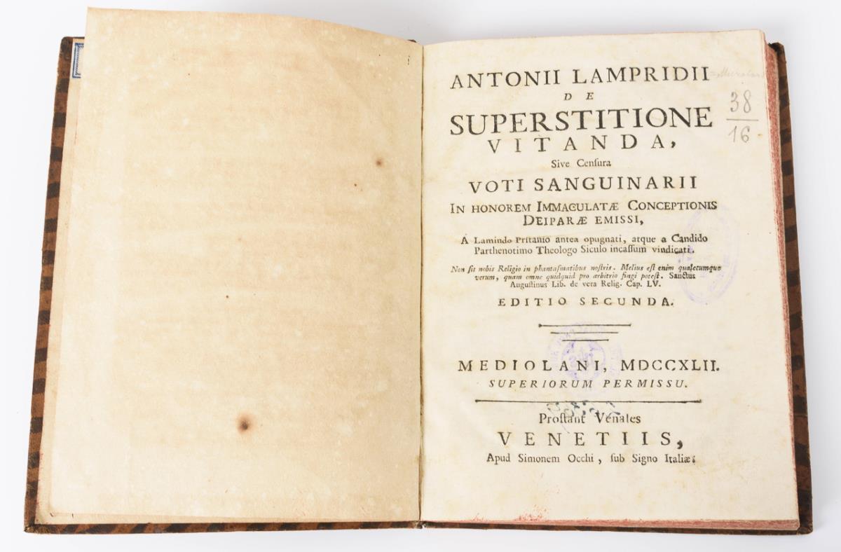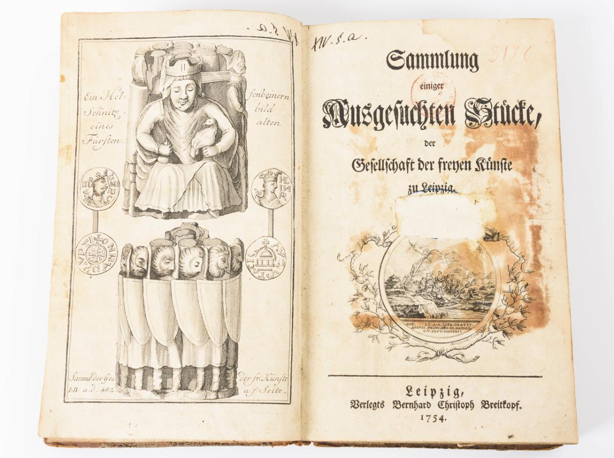 P.S. Hillersche Buchhandlung. Dresden. 1827. 16,128, 131, 12, 172, 8, 159 pages, in half cloth binding. 17 x 10 cm. Spine somewhat damaged. / Friedrich Gottlob Klopstock: "The Messiah" - 4 volumes in two books. In the Bureau of German Classics. Carlsruhe. 1815. 28, 308, 24, 279 / 20, 436, 24, 292, (2) pages. Possibly missing a page in the title page. Half leather binding and marbled edges. 19 x 11.5 cm. / Antonii Lampridii (Muratori): "De superstitione vitanda sive censura voti sanguinarii". Apud Simonem Occhi. Venetiis (Venice). 1742. 23 x 17 cm. 2nd edition, published in the year of the first edition. Title, (10), 216 pages in leather binding. Library stamp "Bibl. Theologiae Prov. Hung. S.J." Important Italian scholar, founded Italian historiography. / "Collection of satyrical writings", Leipzig 1751, published by Johann Gottfried Dyck. 2 parts in one book, 212 and 288 pages, leather binding / "Sammlung einiger Ausgesuchten Stücke, der Gesellschaft der freyen Künste zu Leipzig", Leipzig 1754, published by Bernhard Christoph Breitkopf, 498 pages. Half leather binding