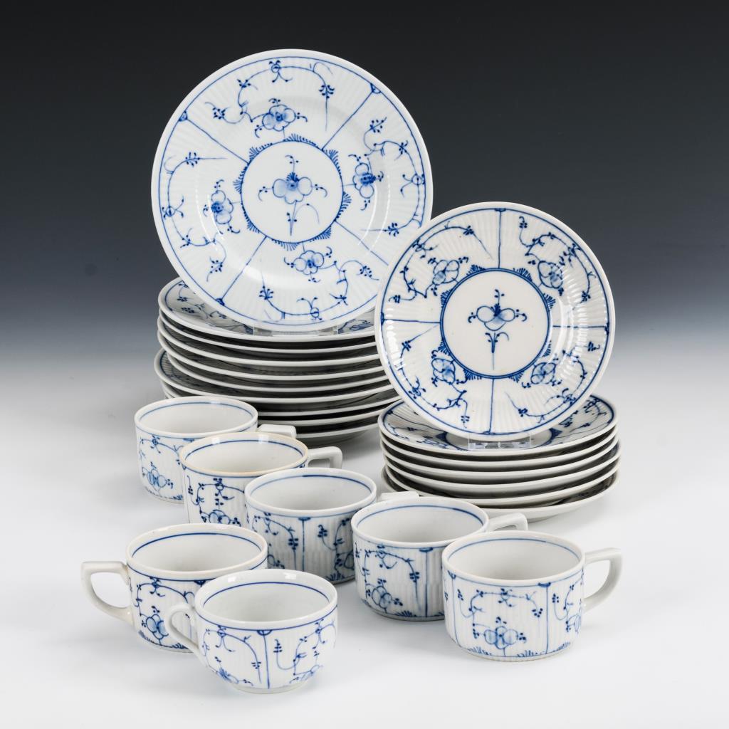 24 Teile. Gebrochen gerippte Wandung. 6 Zylindertassen (H 5,5 cm) und 1 bauchige Tasse, 7 Untertassen und 10 Frühstücksteller.