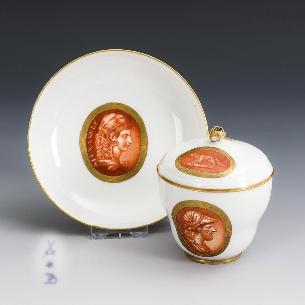 Bell-shaped cup with twisted handle. On the front as well as in the mirror of the saucer a gold-framed medallion depicting an antique head, inscribed "Philippus" and "Alexander". Minimal gold abrasion, bump on the flower knob.
