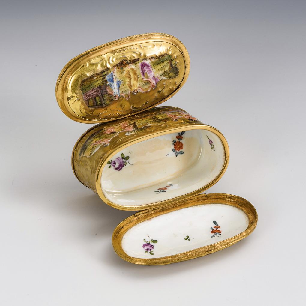 Oval box with two metal-mounted hinged lids and rocaille and figural relief on all sides with dancing and bathing scenes, each with scattered floral painting. 1 lid restored, minimal gold wear.