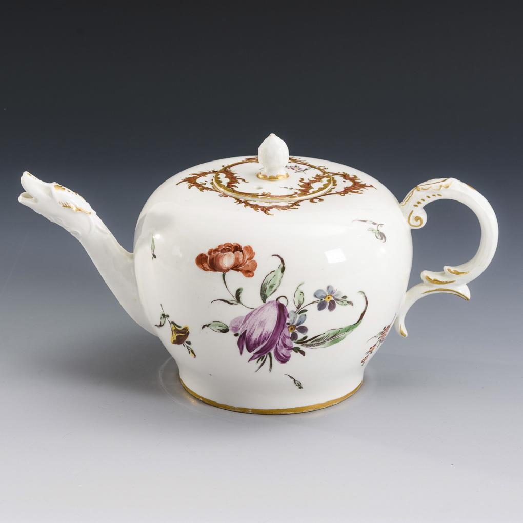 Teapot with animal-headed spout, rocaille handle and knob lid. Restored handle.