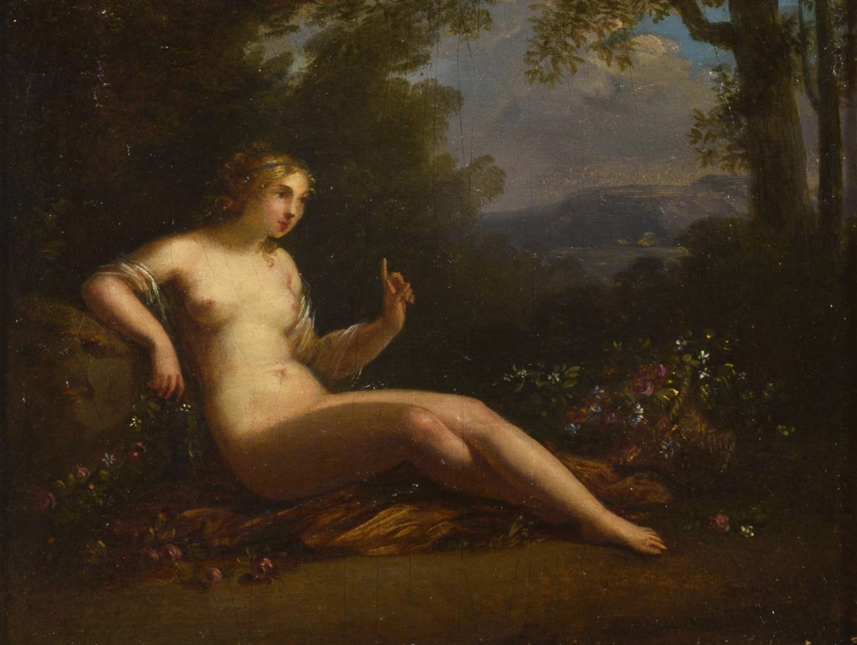 Nude young woman leaning on a rock at the edge of the forest with a basket of flowers. Slight signs of age.