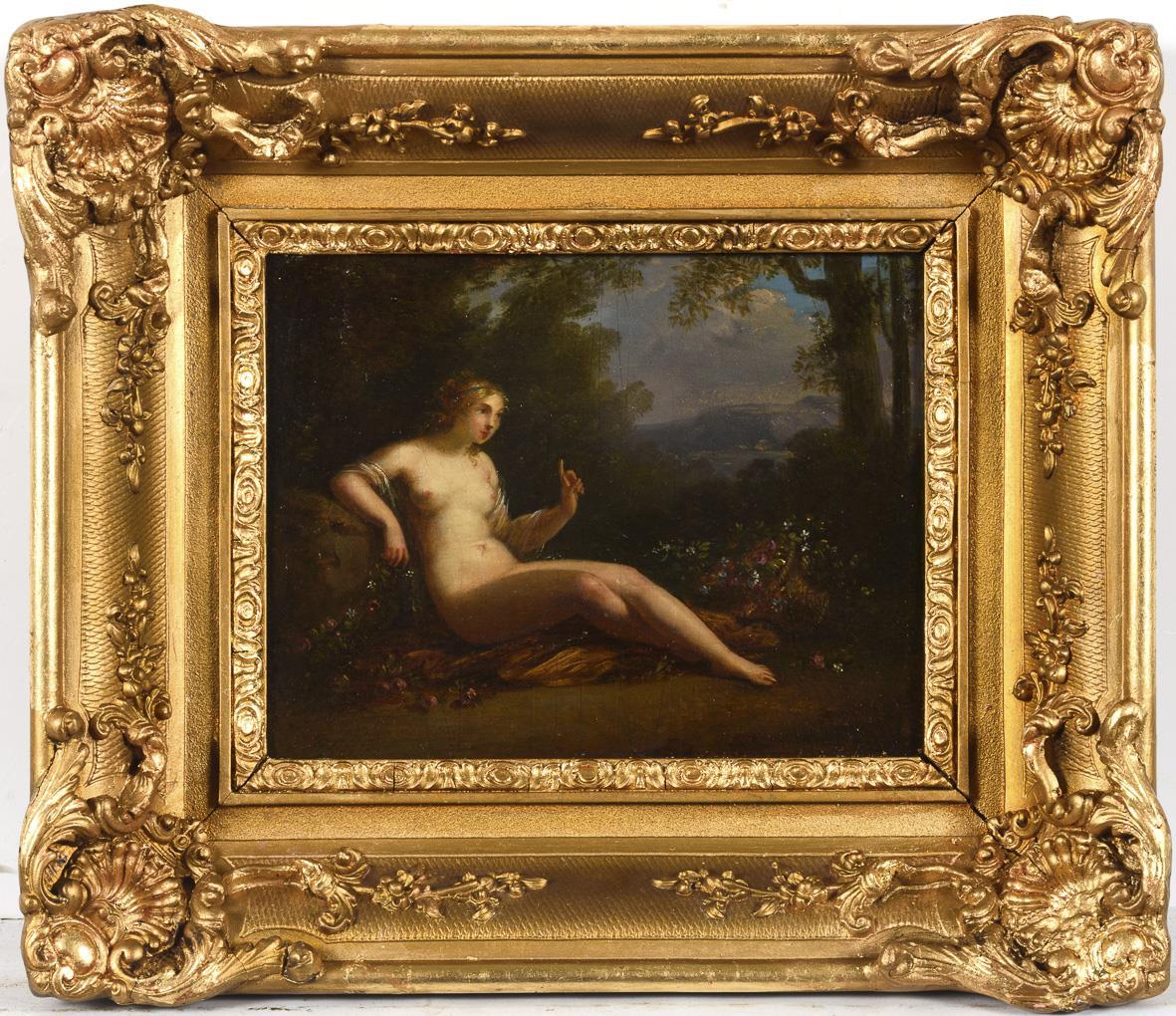 Nude young woman leaning on a rock at the edge of the forest with a basket of flowers. Slight signs of age.