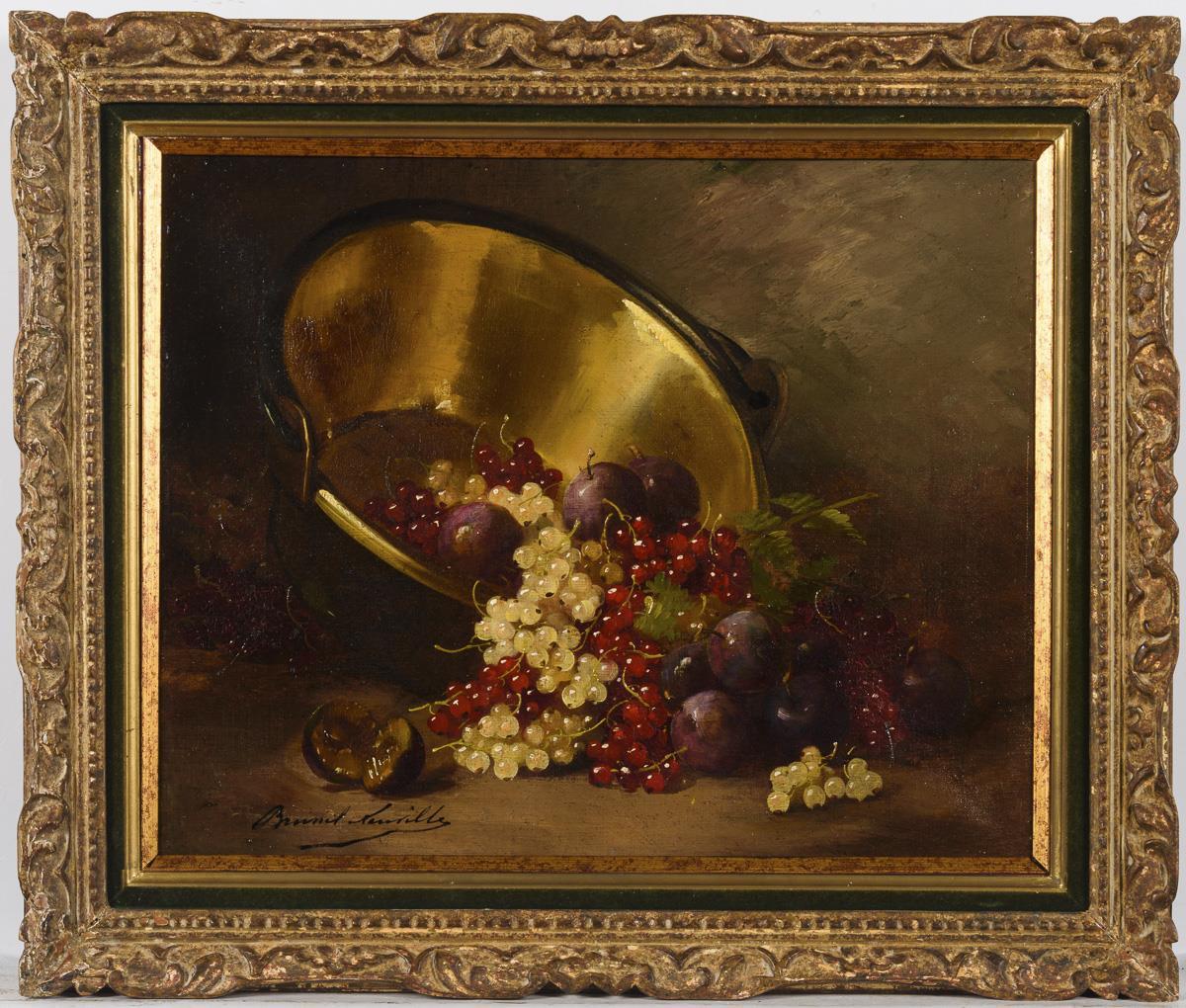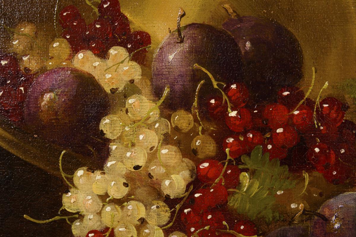 Plums and Currants in a Tilted Bowl. A very small restored spot with backing.