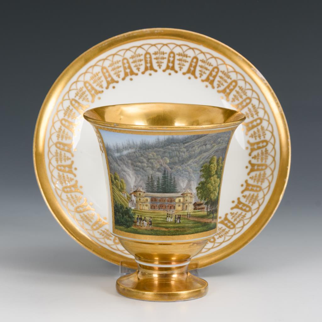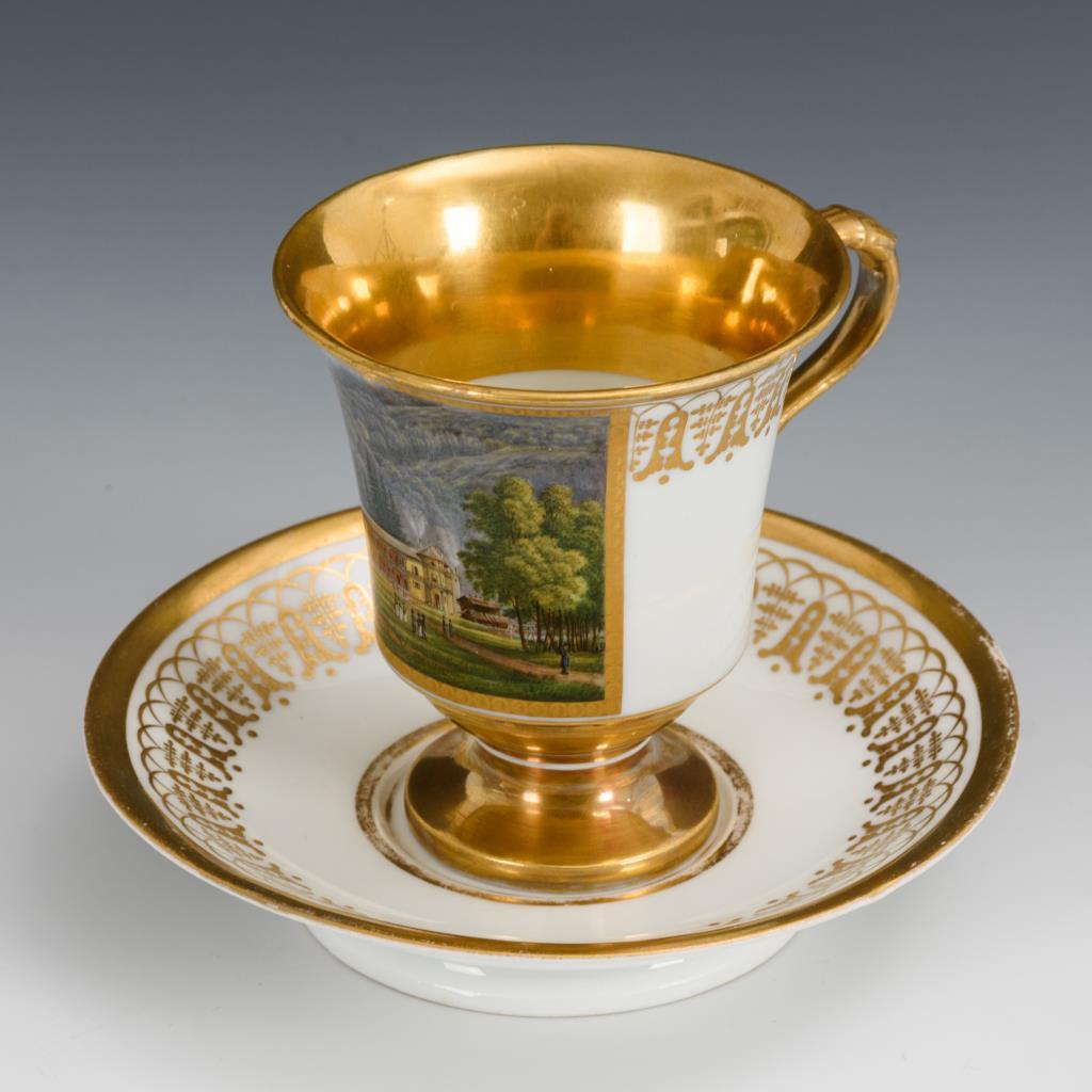 Gefußte Glockentasse mit Blatthenkel. Schauseitig eine Rechteckkartusche mit der unterseitig bezeichneten Ansicht des Kurhauses in Saint-Gervais-les-Bains/Frankreich. Untertasse mit minimalem Goldabrieb.