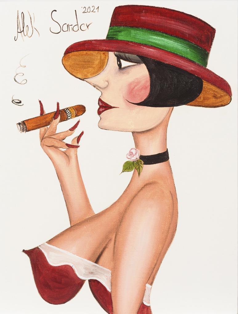 Comic-like and naively painted woman in profile with cigar and hat.