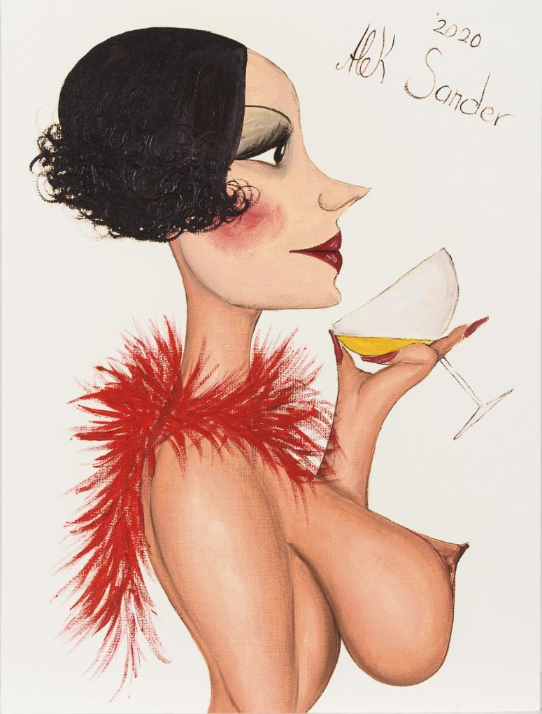 Comic-like and naively painted female nude in profile with glass.