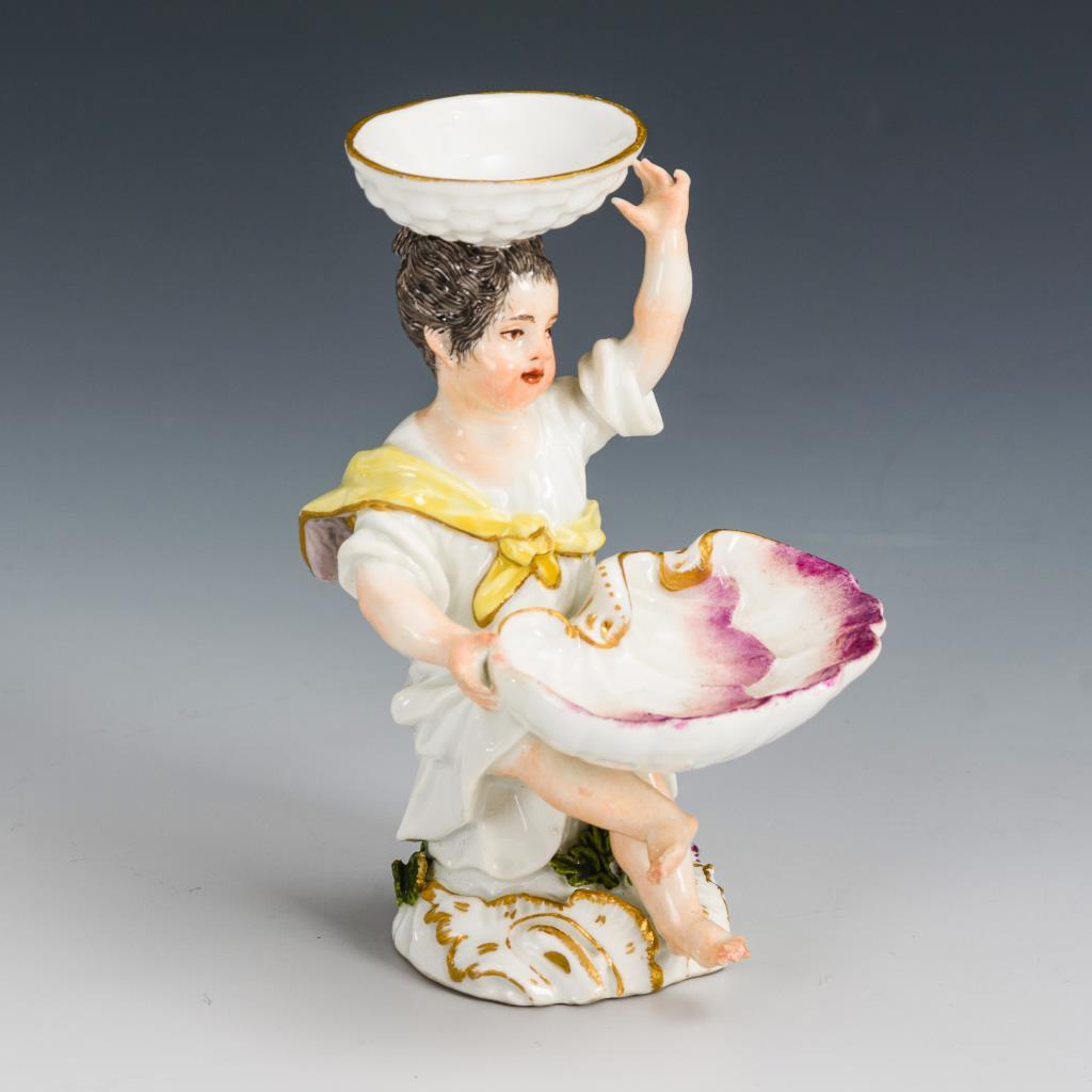 Sitzendes Mädchen mit Muschelschale, auf dem Kopf eine Korbschale haltend. 2 Fingerspitzen und 2 Blätter bestoßen, Bereibung an der rechten Wange. Kleine Restaurierung am Rand der Muschelschale.