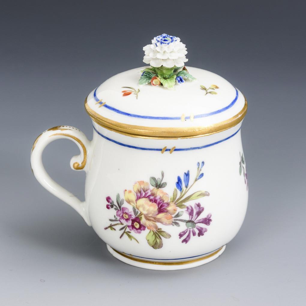 Cup with ear handle and flower knob lid, a bouquet of flowers on both sides. Damages to the flower knob.