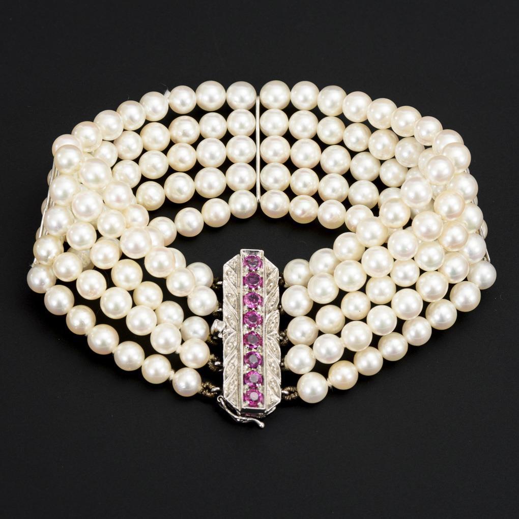 Lacing chains with cultured pearls, on decorative clasp with 8 embedded rubies. Box lock with eight-lock.