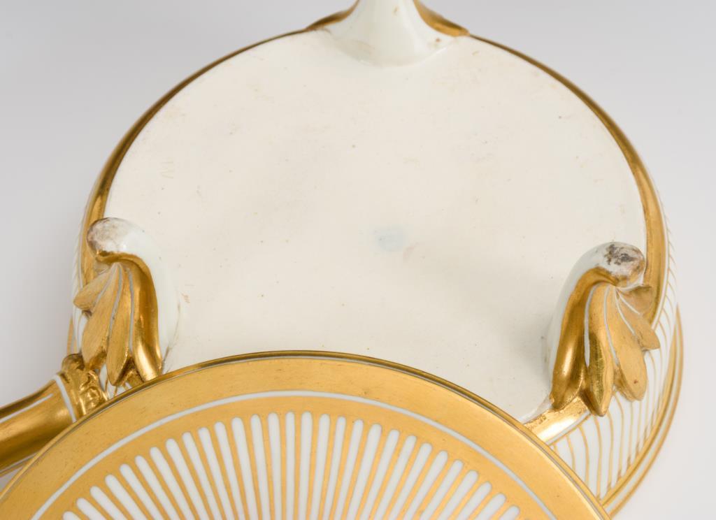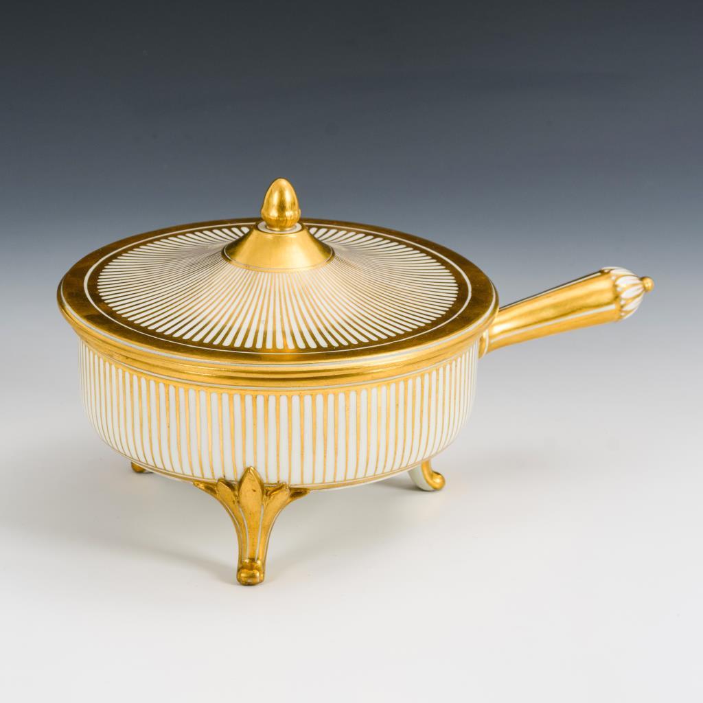 Stielpfanne auf drei Füßen. Goldenes Streifendekor.