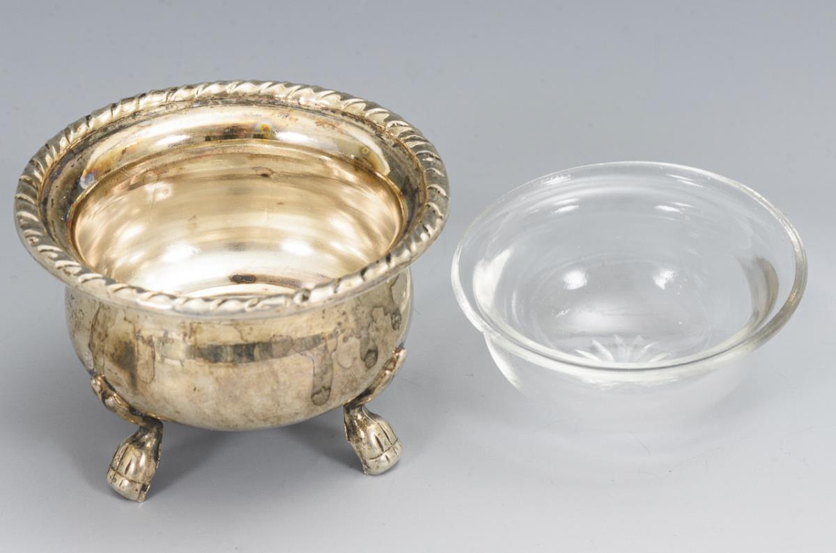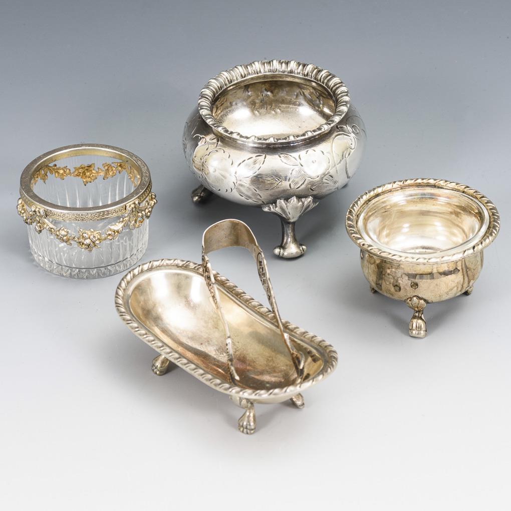 Various salt vessels: 1x oval, 1x with floral engraving, 1x glass with silver mounting, 1x with glass insert. In addition, sugar tongs. Metal minimally dented, glass with tiny edge bumps.