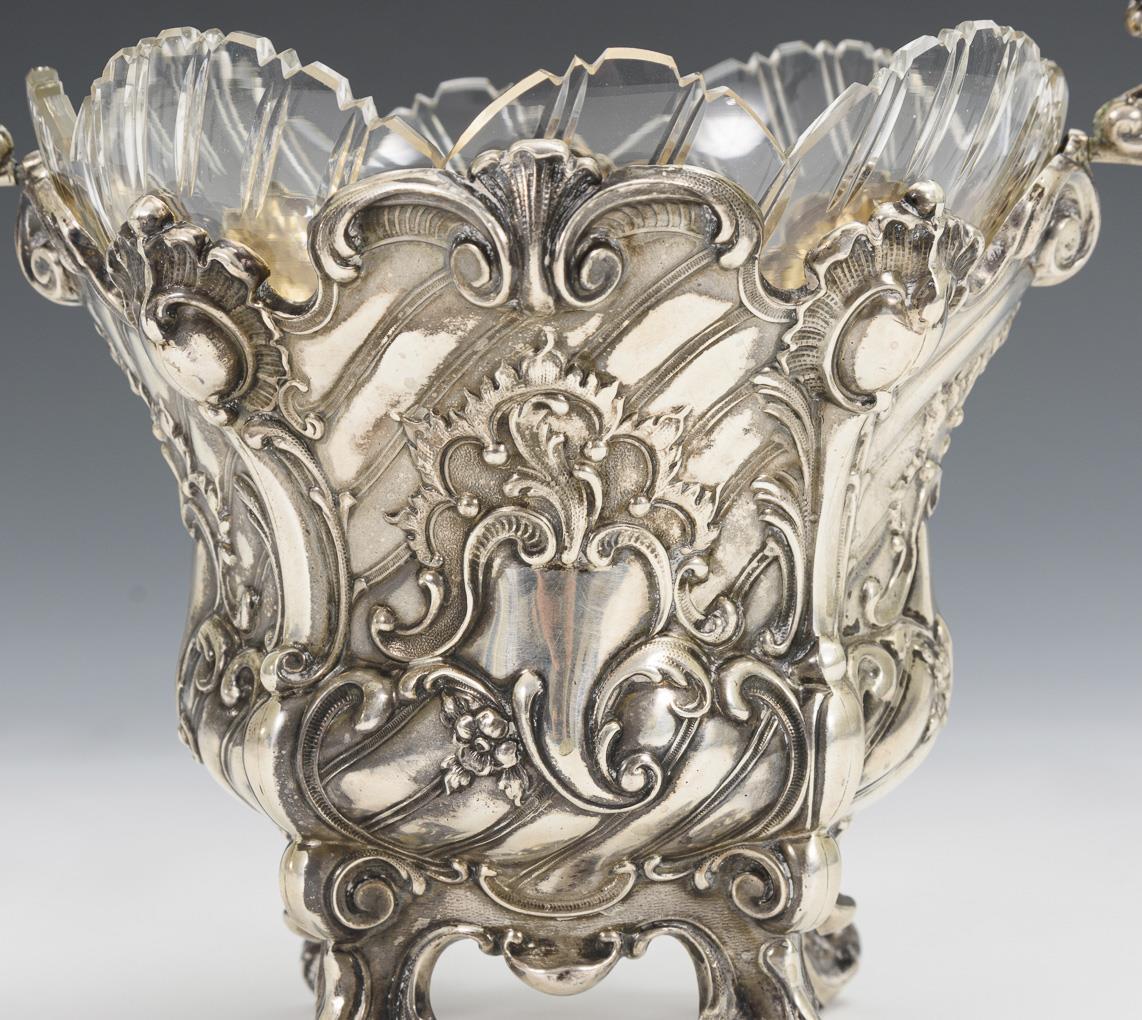 Four-piece relief bowl with historicist rocaille decoration, empty armorial reserves and bow handle, on 4 feet. With matching glass insert.