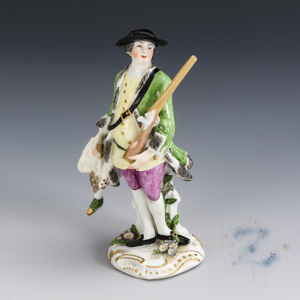 Hunter standing on a rocaille plinth with rifle and killed wild duck. Rifle barrel, 1 duck wing, duck head, hat, left hand and some leaves restored.