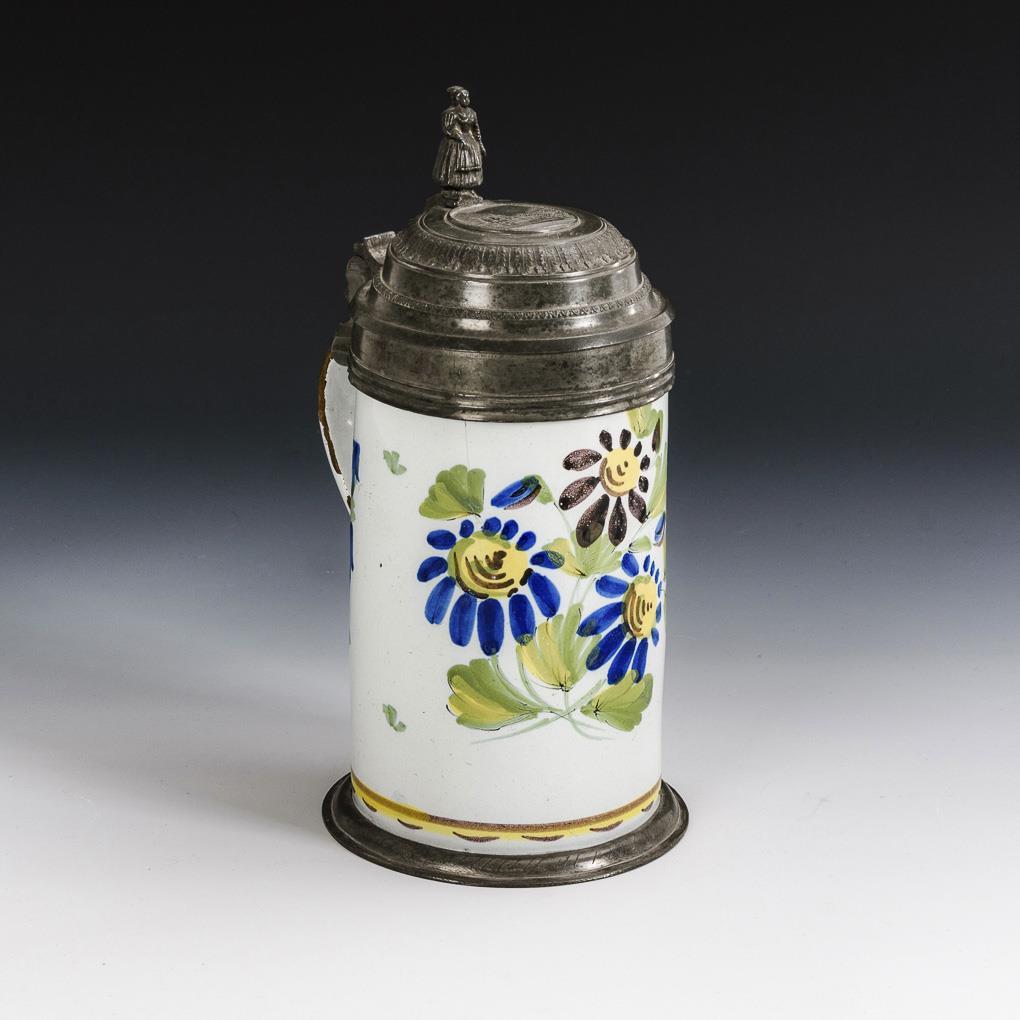 Cylindrical form with ribbon handle. Profiled pewter lid with relief plaque and figural pusher, engraved "I.E.", pewter stand ring. Slight signs of age and wear, including wall crack, glaze defects, pewter hoops loose.