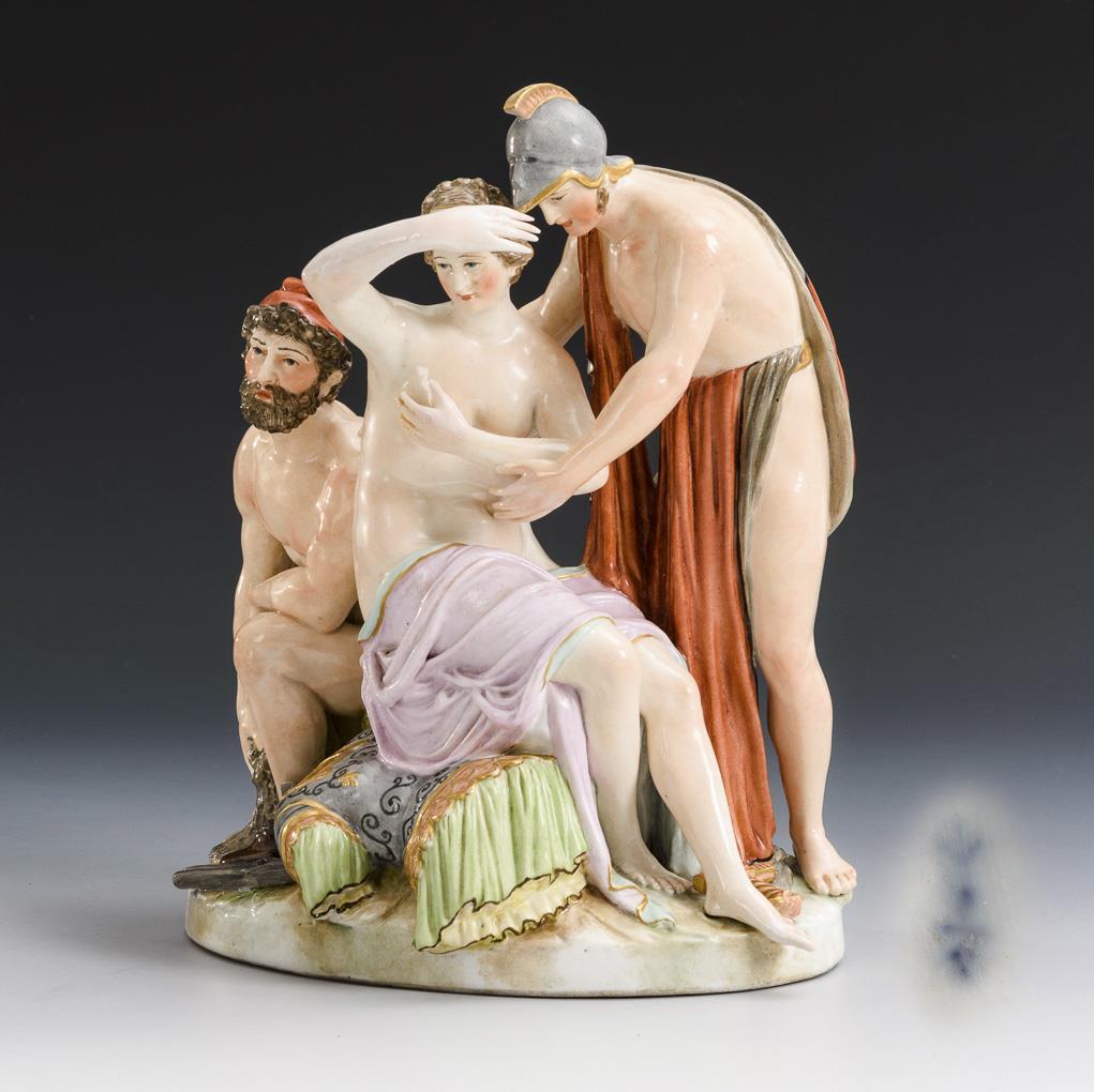 Standing god of war Mars, embracing Venus seated on his armor, on the right of Venus Vulcan, the god of fire, kneeling, verso inscribed. Right leg, right arm and both hands of Venus, left hand of Mars and tongs restored.