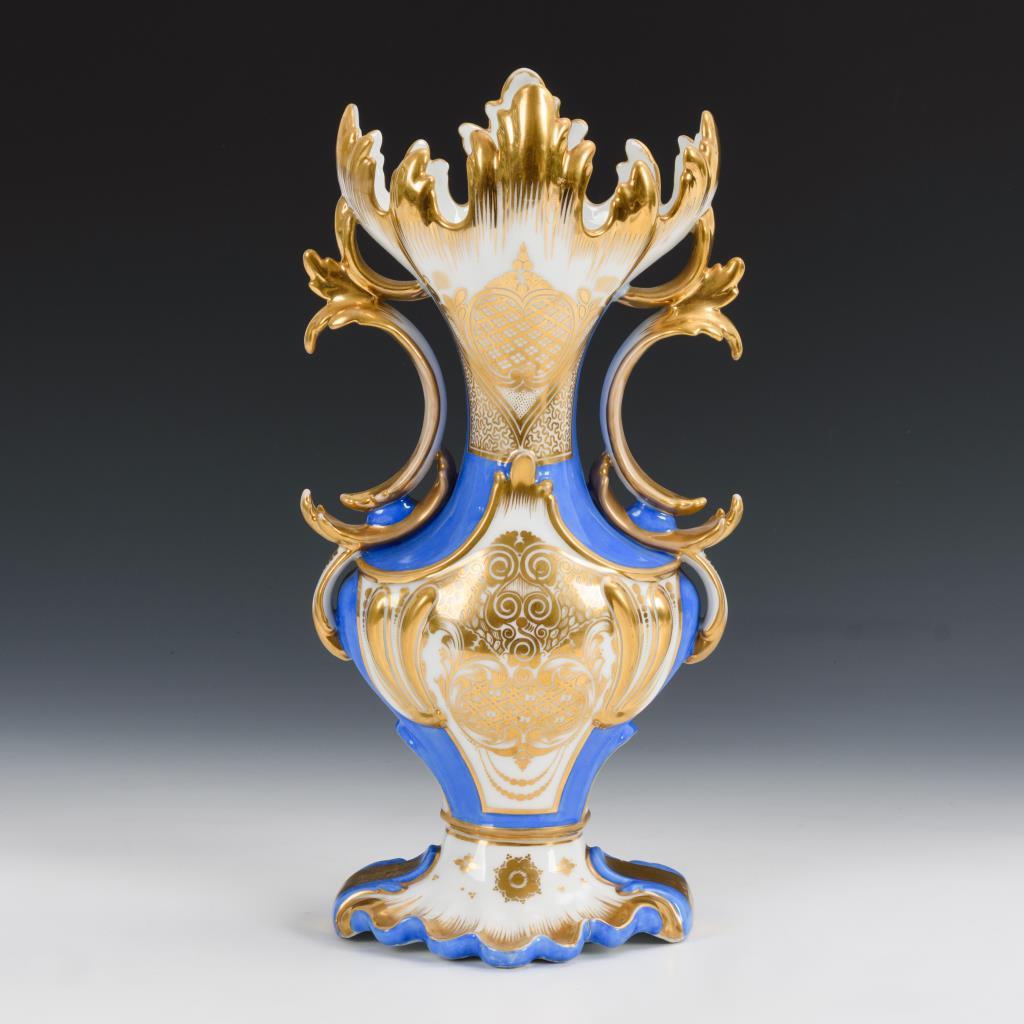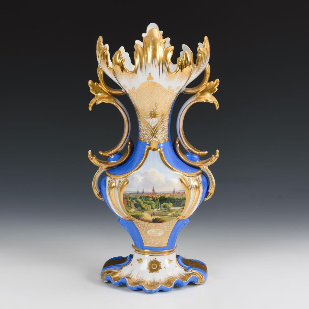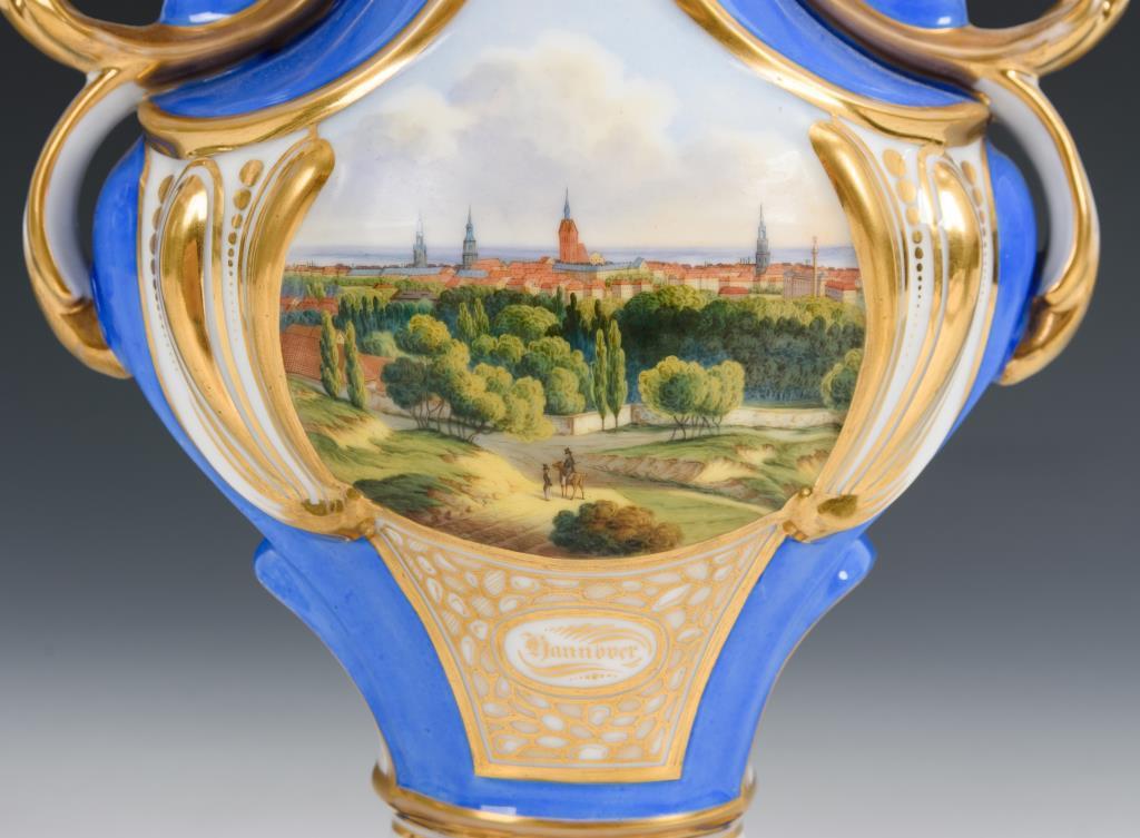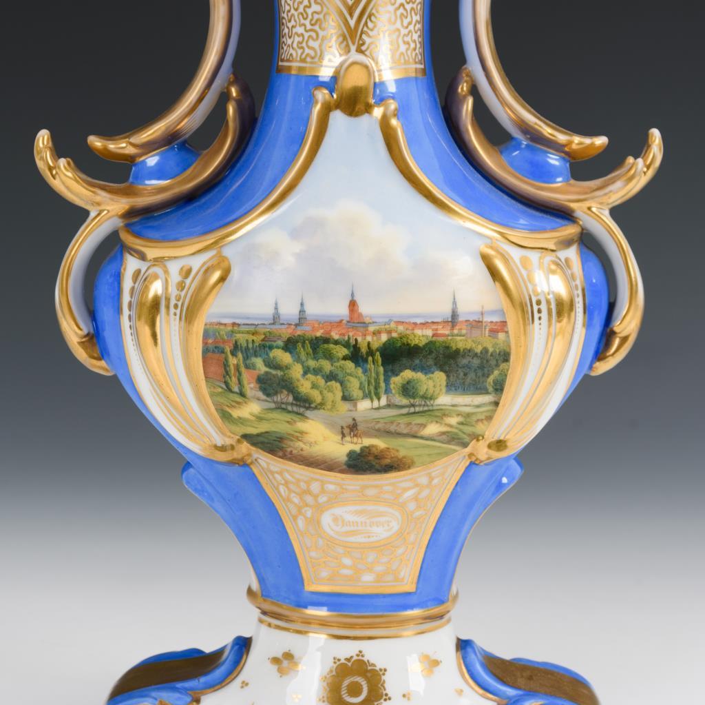 Gedrungene Balustervase mit schlankem Hals, weit geöffneter Mündung in Form von Blättern, zwei Henkeln und gemuscheltem Fuß. Blauer Fond, schauseitig die bezeichnete Ansicht der Stadt Hannover, verso ornamentale Goldmalerei. Partieller Goldabrieb, verso Brandriss am Fuß.