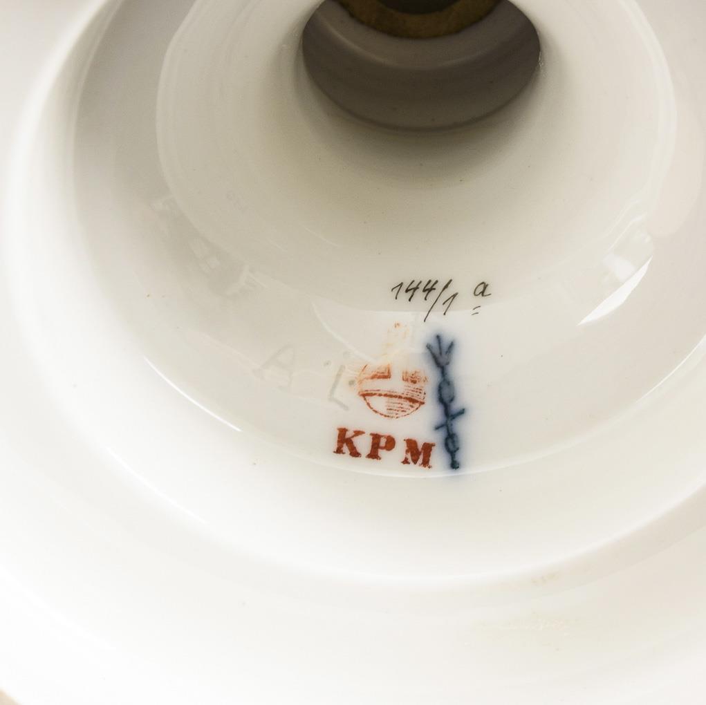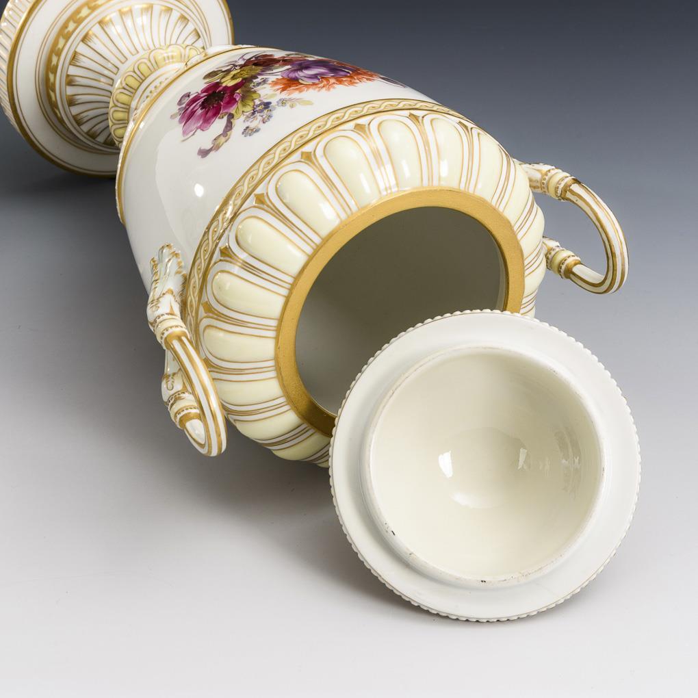 So-called "Weimar vase". Yellow and mint partial background. On the front the depiction of a young couple in a landscape, on the verso a bouquet of flowers. Lid and 1 handle restored.