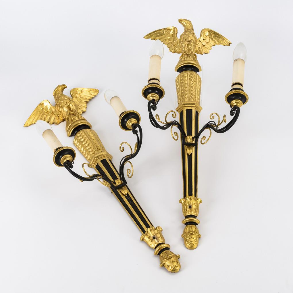 Wall mount in the form of an arrow quiver with eagle crowning, 2 volute arms with the "candles". Few signs of age/use, function not tested.