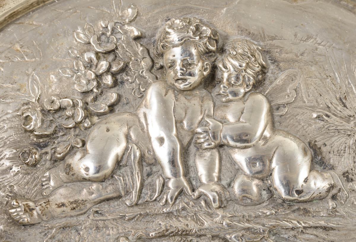 Richly relieved bowl with elf motifs and flower garlands. Light signs of use.