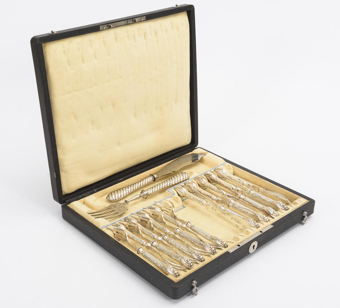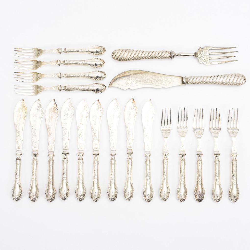 9 forks and 9 knives with rocaillereliefed handles and fish motif engraved blades and tines. Pre-laying knife and fork with spiral turned silver handle (filled, with dents) and floral engraved steel blade.
