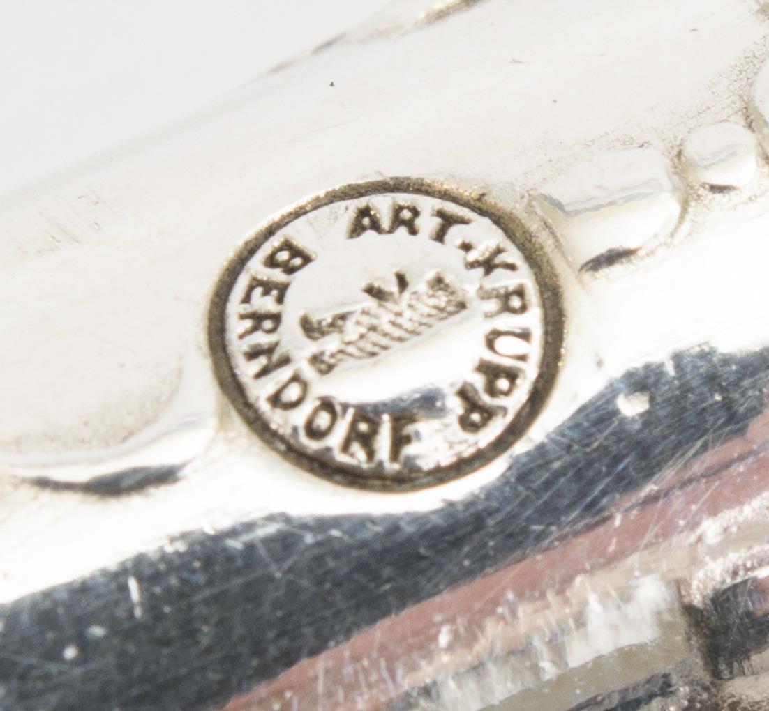 handles with company stamp Art. Krupp, Berndorf stamped, serving pieces indistinctly hallmarked crescent/crown/800. Circa 1900.