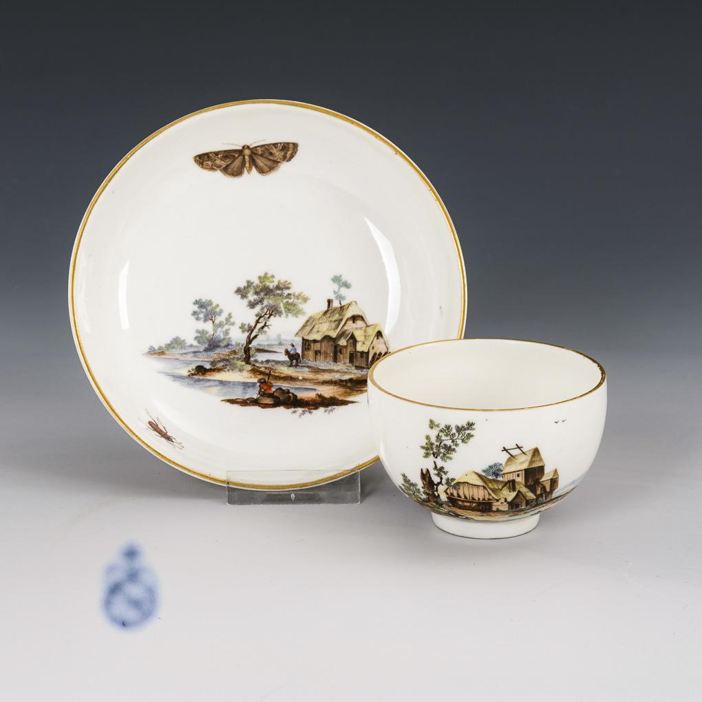 Bellied cup with ear handle. On cup and saucer the depiction of small landscape with thatched houses. Minimal gold abrasion.