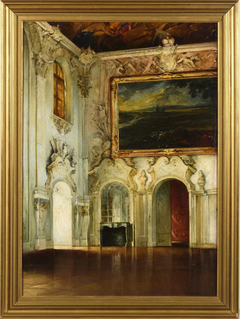 View of the hall with a large painting under the vaulted ceiling. Little retouched.