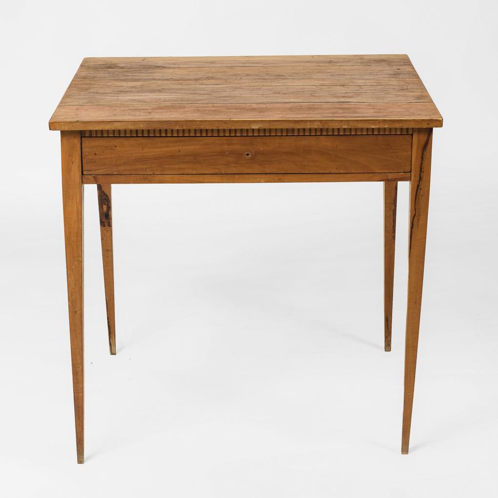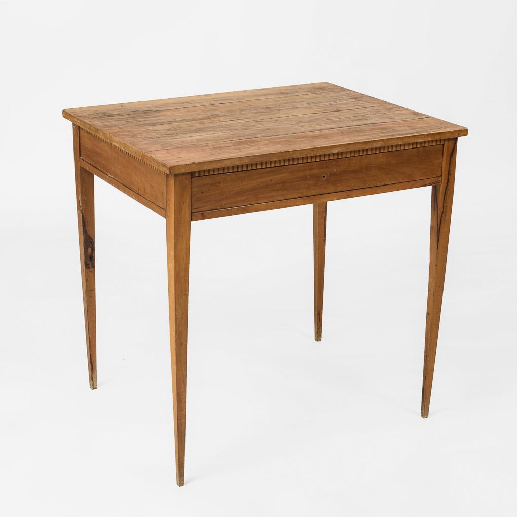 Simple, rectangular salon table in classicist style, on 4 tapering pillar legs and smooth frame with drawer, frame sparsely inlaid with surrounding triglyph band. Top dry-cracked and in need of restoration, frame knob missing.
