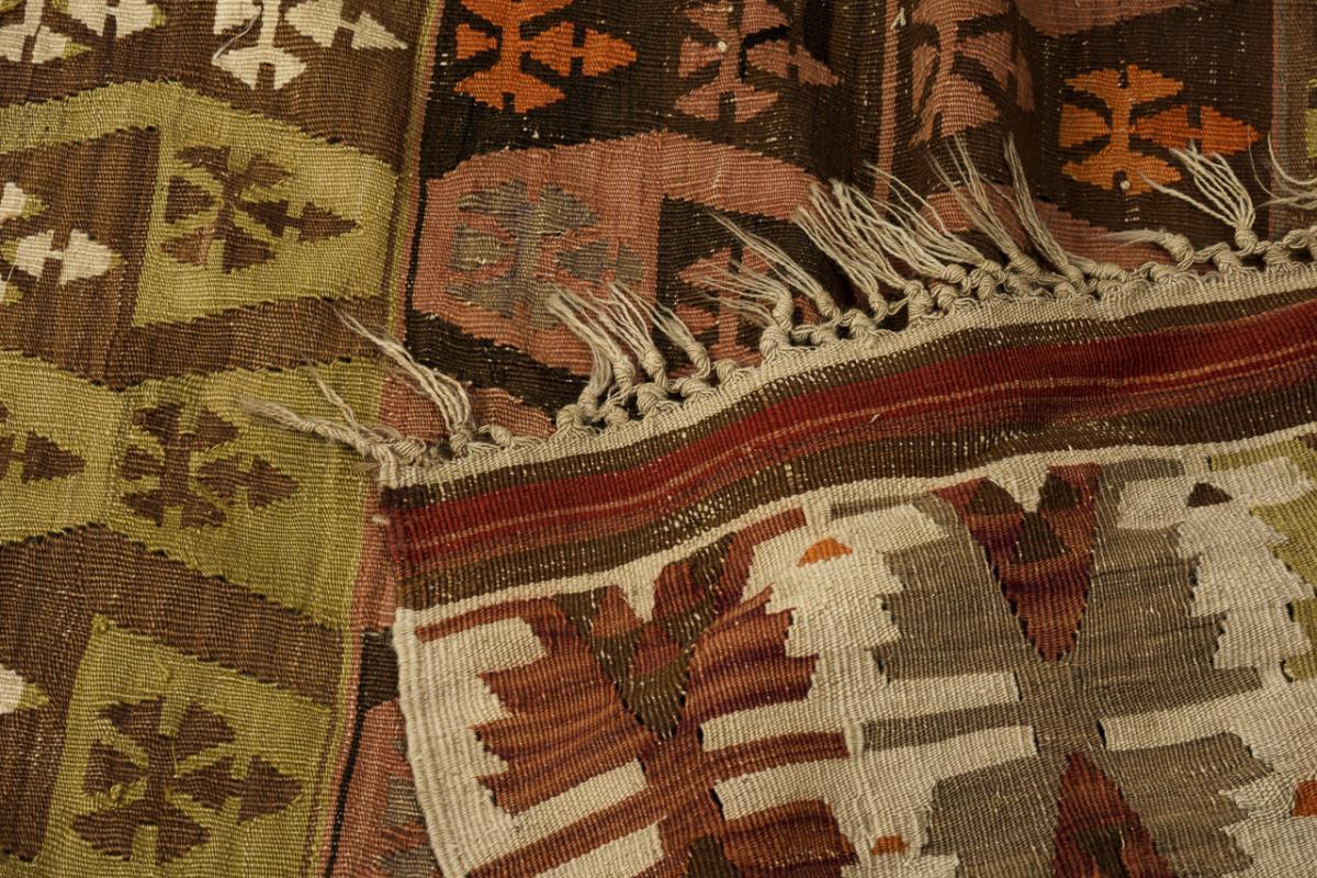 Middle field with 7 mirrored color stripes and stylized Elibelinde decoration. Serrated border with stepped mirrored decorative elements, narrow sides with kilim finishes and knotted fringes. Longitudinal verso with sewn pleated band. Completely warped, with defects and signs of age.
