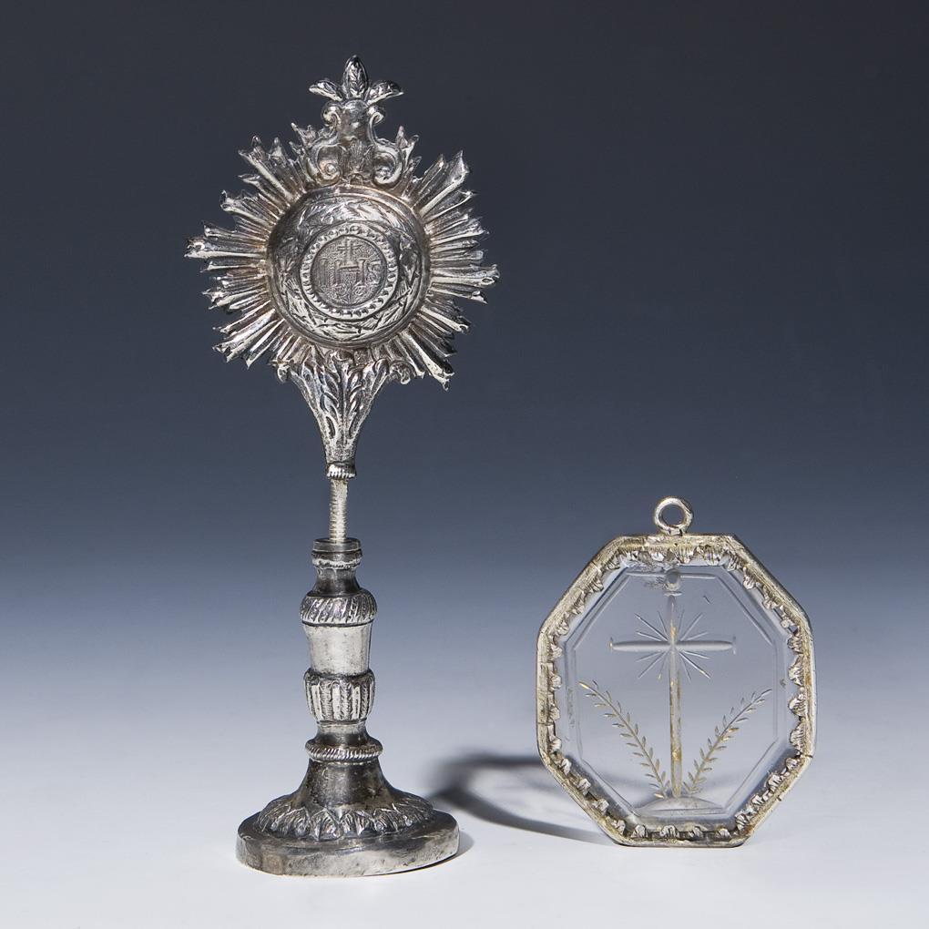 Glass pendant with residual gold-plated cut decoration in silver setting. Rays monstrance. Central Christ monogram IHS. Indistinct hallmark. Glass bumped at the hole, screw thread of the monstrance supplemented.