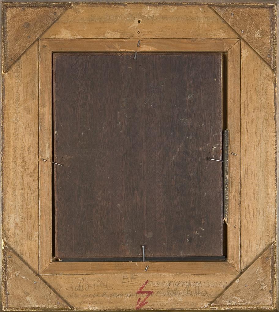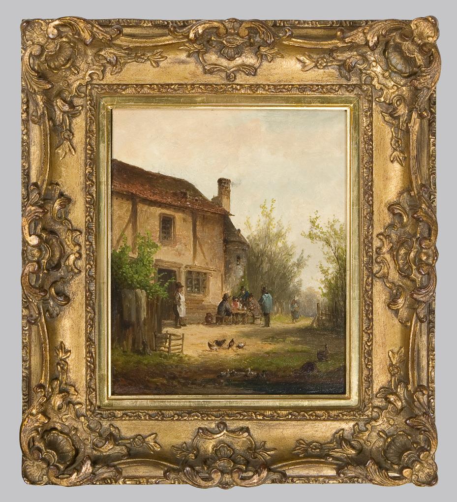 Kleinformatige bäuerliche Genreszene mit diversen Figuren. Vergoldeter Stuckrahmen.
