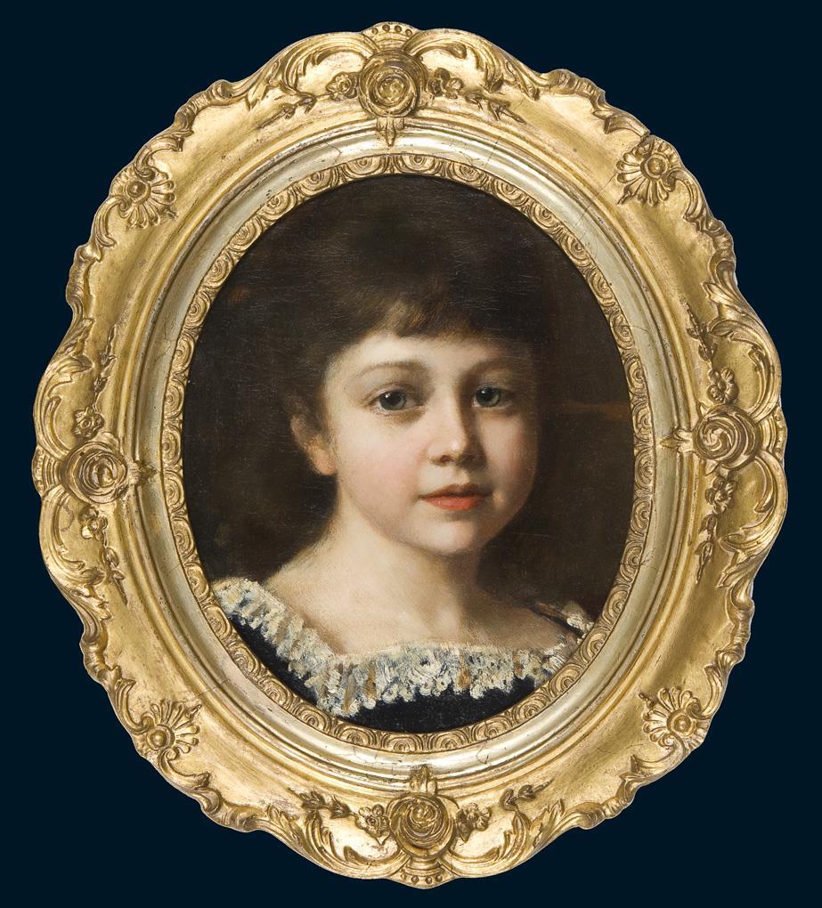 Finely painted childlike charm with big eyes, small nose and cuddly forms. Oval gilt stucco frame from the time.