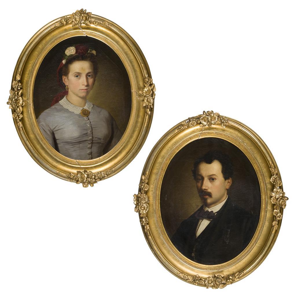 Anna Maria Jung, née Zwanziger, 1843 Nuremberg - 1906. She wears a brooch with the portrait of her husband. Johann George Jung, 1832 Altenmuhr near Nuremberg - 1892. inscribed on adhesive label on reverse. Original stretchers, original gilt stucco frames with plastic flowers. Frame partially defective, three patches on the back.