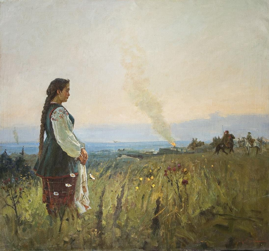 The young Ukrainian girl stands sadly in the steppe, looking at the Cossacks in the distance. Without frame.