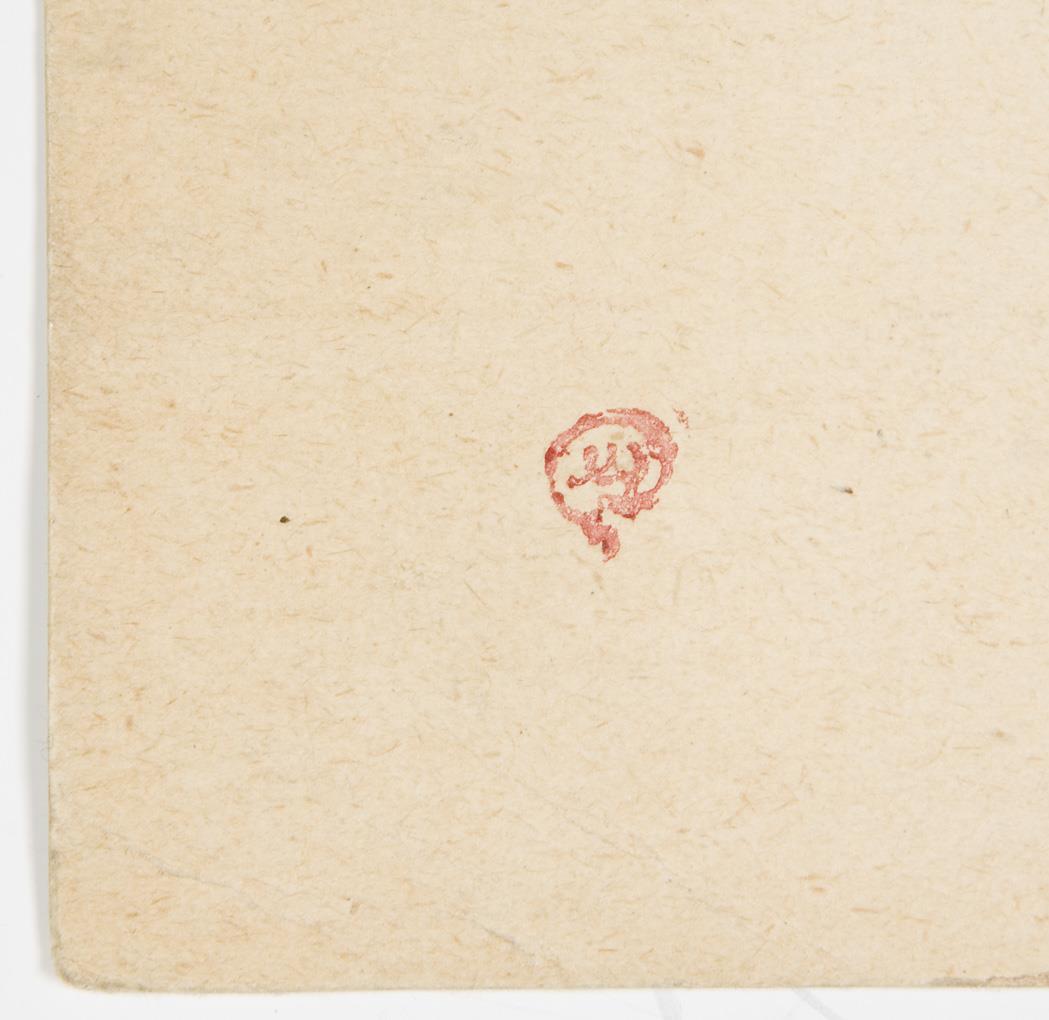 Draft for a stage set in light coloration. Watercolor and gouache over pen and ink drawing. Red monogram stamp on the back. Without frame. Top lateral small crease.
