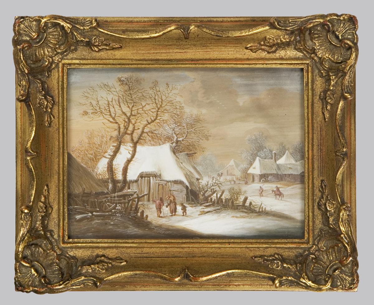 Minutiously painted small-format idealized view with figure staffage of captivating virtuosity, finely executed and rich in detail. As new glazed stucco frame.
