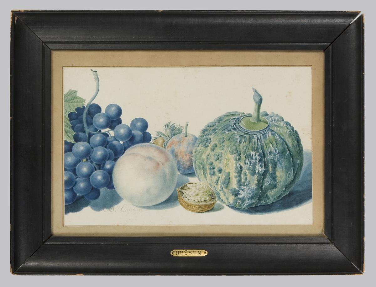 The fruits do not appear as if arranged, but each develops its own independent presence. The subtlety of the watercolors comes to the representation. Glazed blackened frame. Frame partially defective.