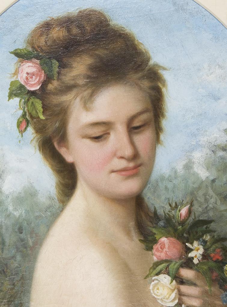 Graceful and subliminally erotic half portrait before a landscape background in restrained pastel coloring. The beguiling charms of the young lady with flushed cheeks and half exposed torso are expressively depicted. Profiled frame with oval mount and wooden back.