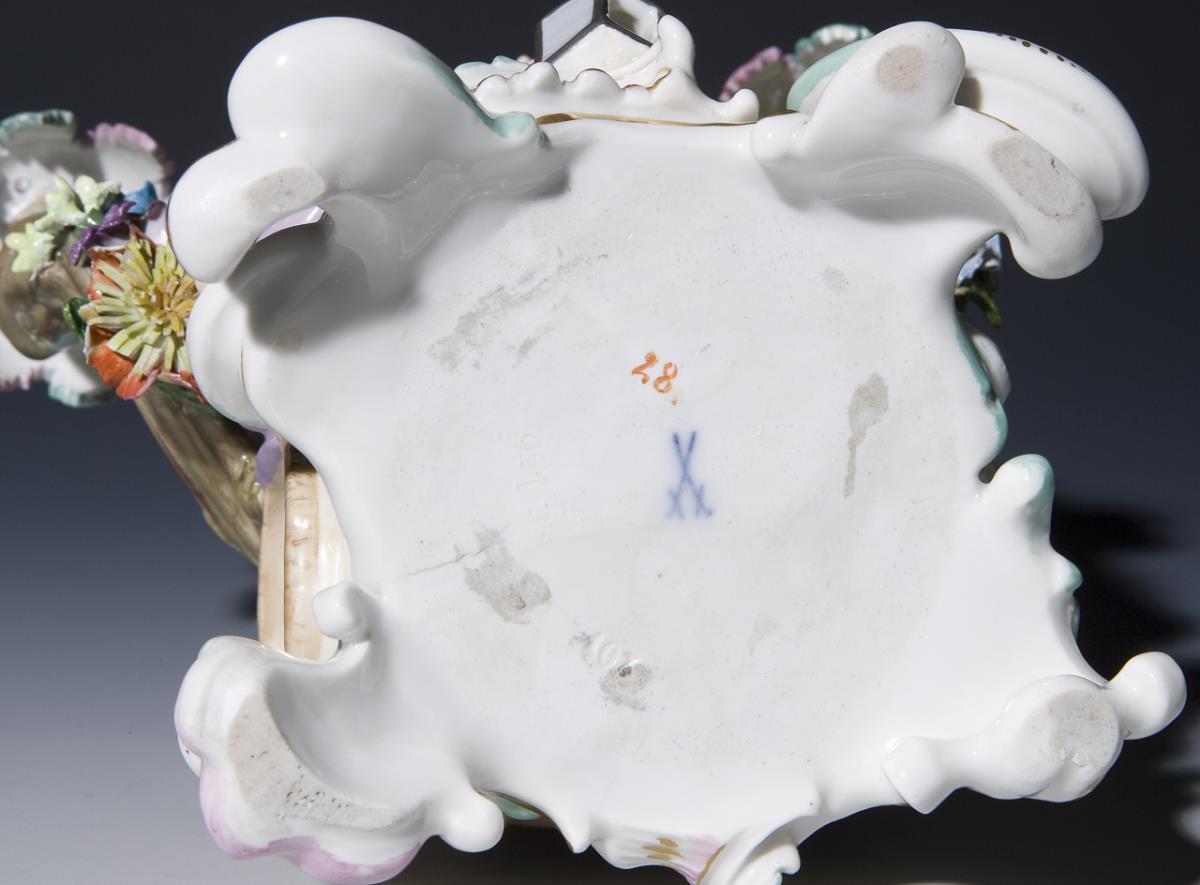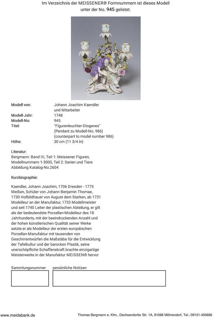 Model by Johann Joachim Kaendler and collaborators 1748. "Diogenes" with his barrel and lantern. Pendant to "figure candelabra-Paracelsus". Colorfully painted, gold painted. Incised mark, press mark, painter's mark, sword mark. Flowers, a hand, spout mounts, some leaves of the drip bowls, lantern knob, a thumb restored, a palm leaf tip bumped, small fire crack in the base.