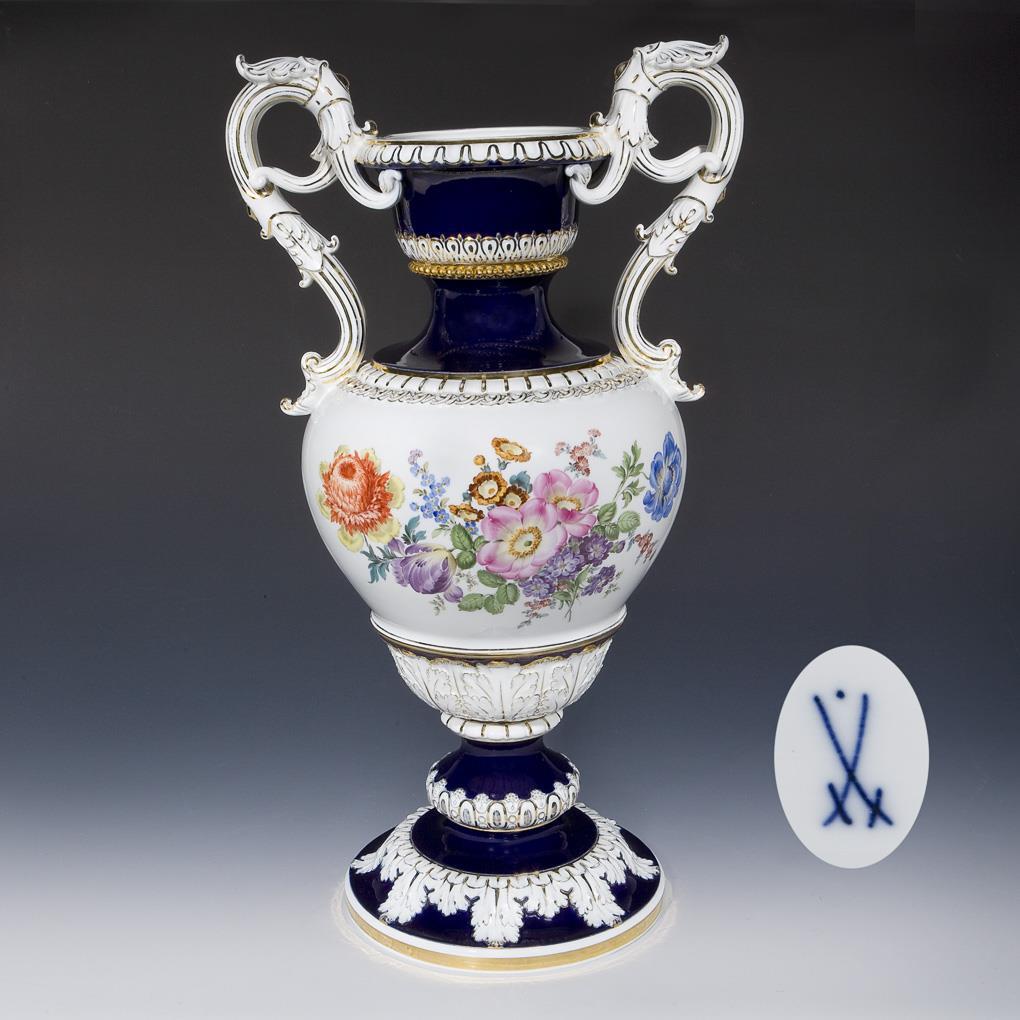 Model by Ernst August Leuteritz 1860. Floral and ornamental relief, gold staffiert. Partial cobalt blue background. Colored floral painting with large bouquets on both sides. Body with raised handles over mounted stand. Incised mark, pressed mark, sword mark with dot.