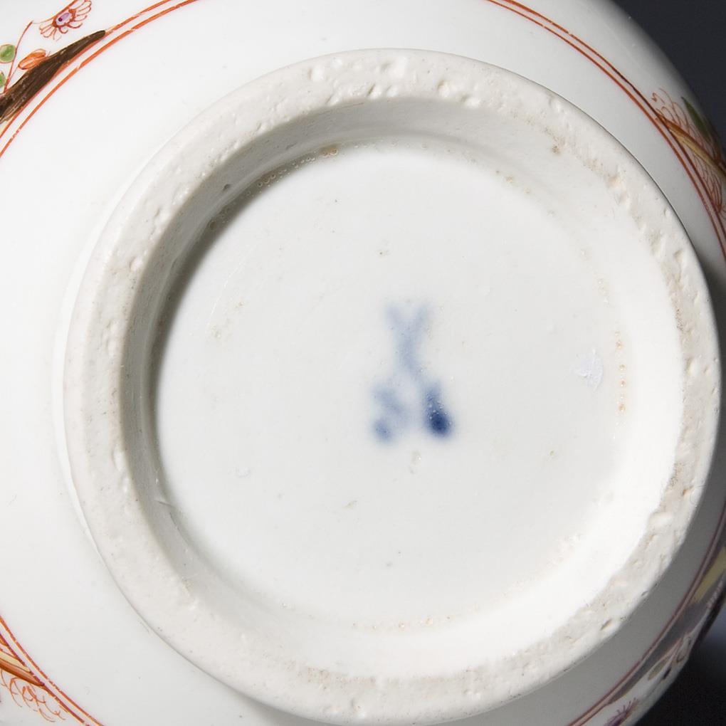 Circumferential colored painting in iron red, sea green, purple, black brown and yellow. Decor with Indian flower branches, fence and rocks. Painting attributed to Johann Ehrenfried Stadler (1701 Dresden - 1741 Meissen). Sword mark. spout and mouth rim restored.