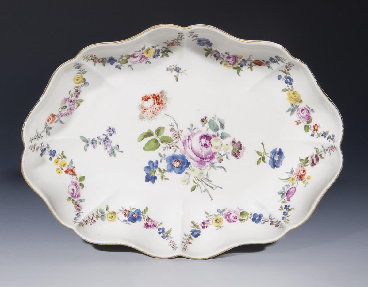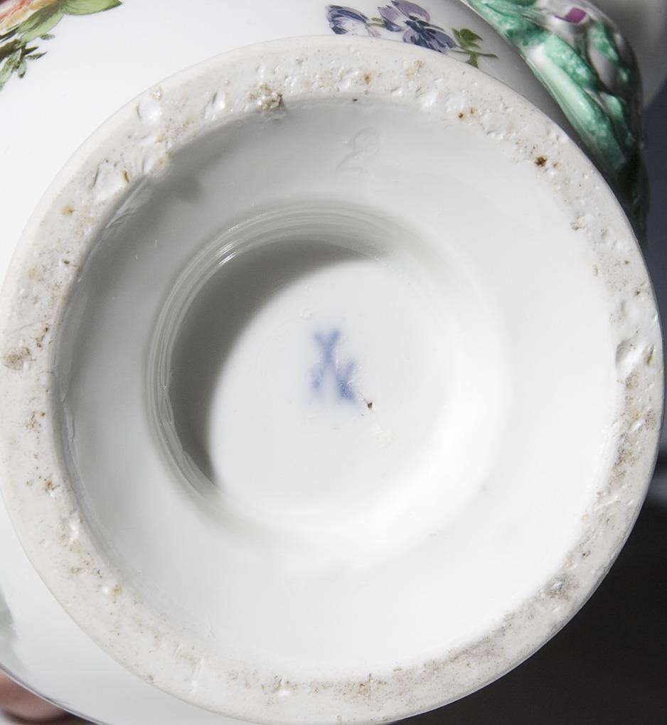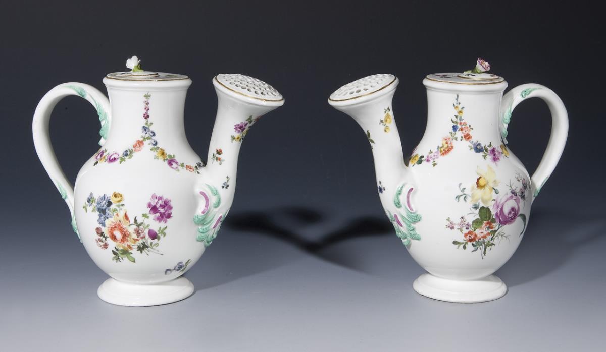 Rich colored floral painting with bouquets, single flowers and festoons, gold painted. Baluster body, small flat lids with plastic flower knob. Handles and spouts with relief attachments. Sword marks. One lid restored, one spout minimally bumped.