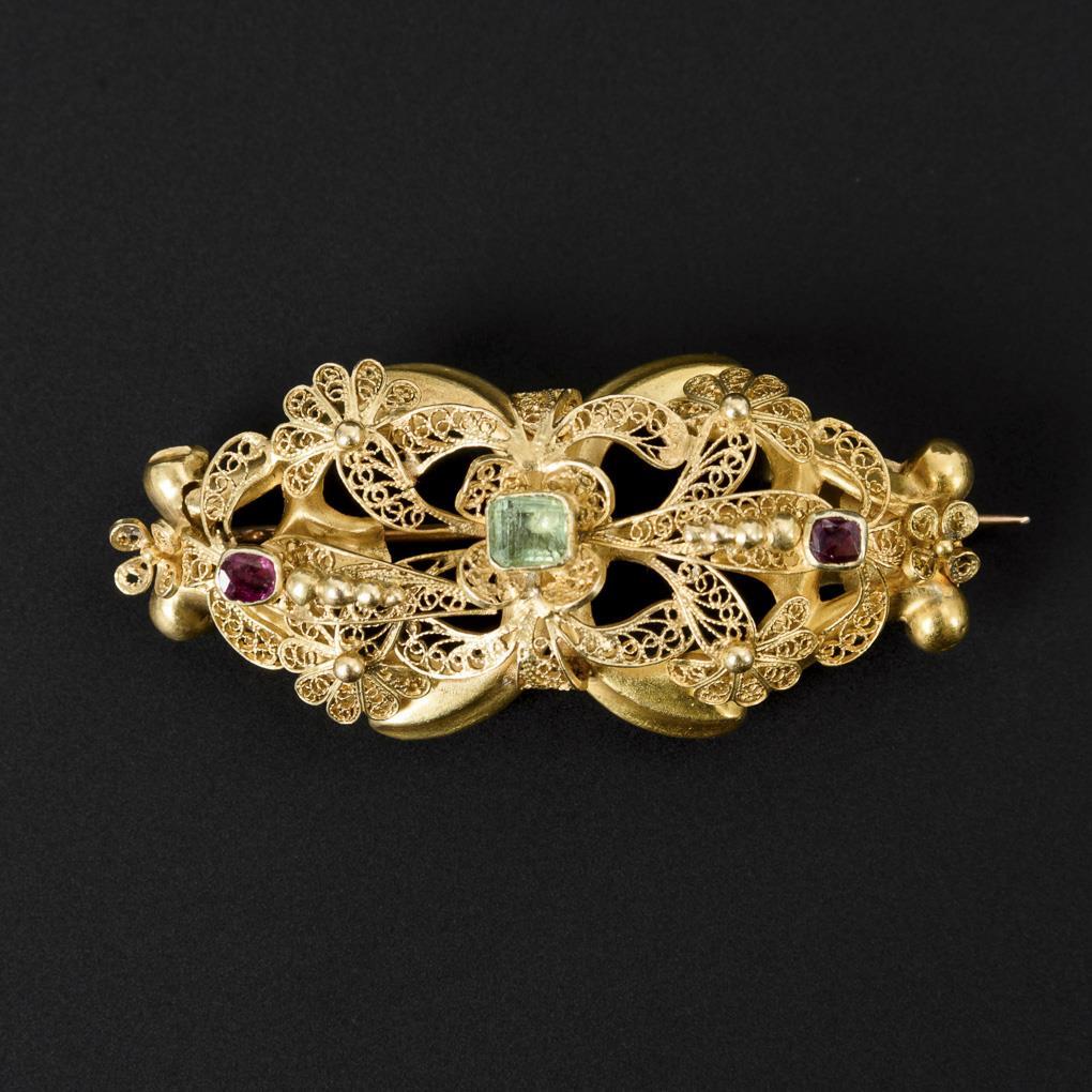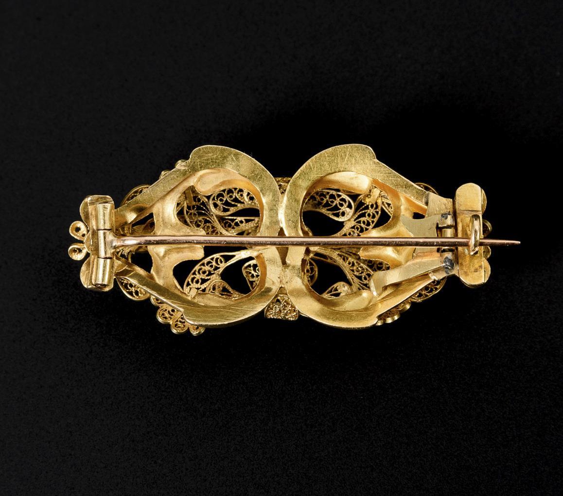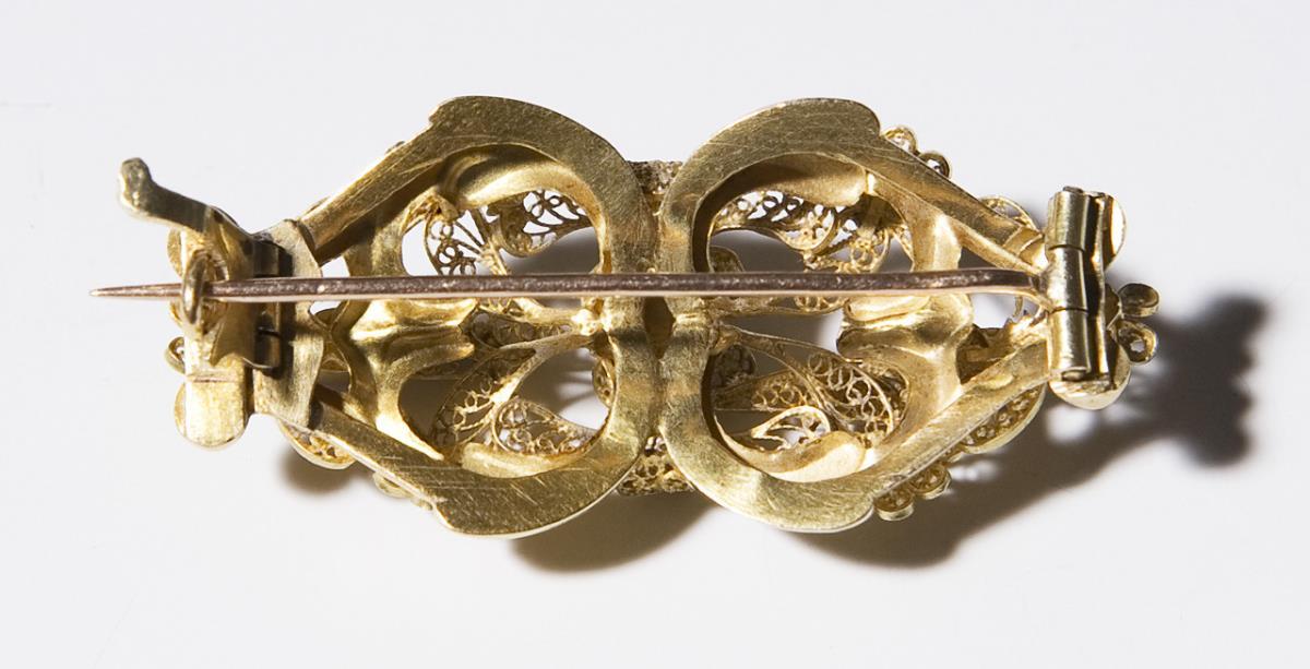Filigantly crafted gold brooch.