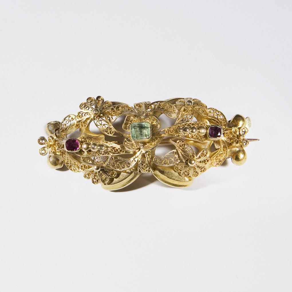Quality and very finely crafted. Colored stone set with peridot and rubellite. Pin with safety hinge.