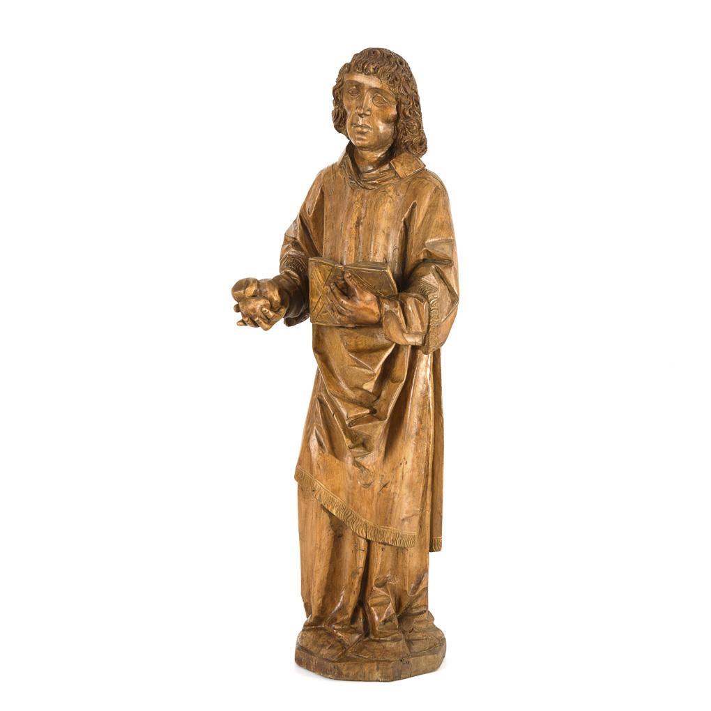 Fully sculptured slender standing figure in detailed robe with rich drapery, adorned at the edges by a fringed hem. In his left hand he holds an open gospel book. In his right hand he holds three stones as a sign of martyrdom. The forearms are bent almost horizontally. Finely worked semi-long curly hair emphasizes the prominent head with sunken cheeks and chin dimples. The look of the almond-shaped eyes, which are highlighted by eyeliner, seems visionary otherworldly values turned towards. hands and attributes supplemented, back smaller y-shaped cracking.