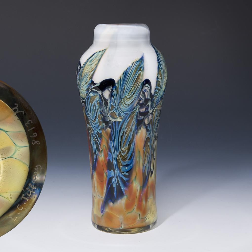 So-called "paperweight glass". Colorless thick-walled glass with colored interlayer decoration. Central feathers in 6-fold repeat over marbled base with three-dimensional effect. Plan ground base with ground base ball. Inscribed: L.C. Tiffany 8613 M.
