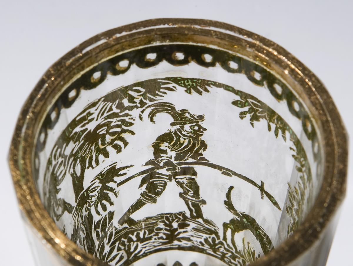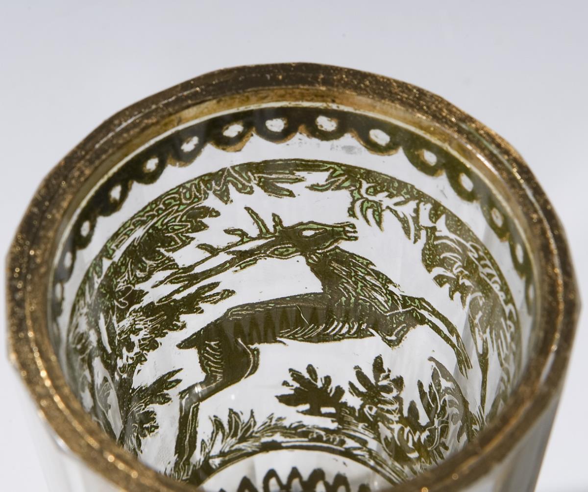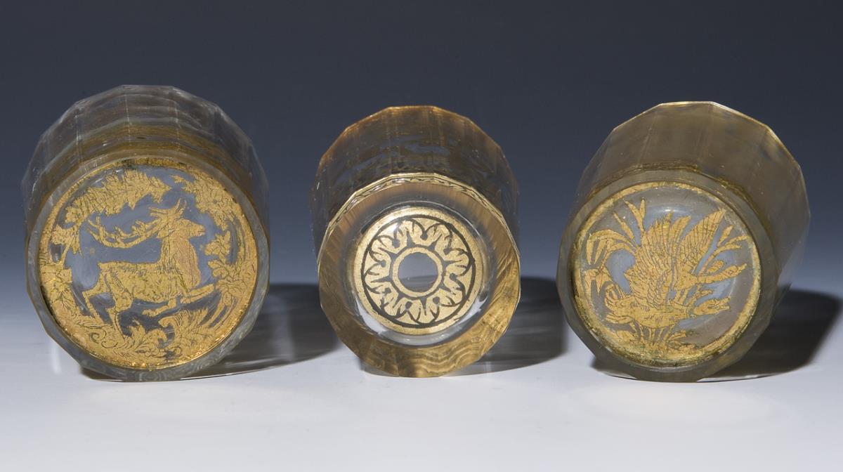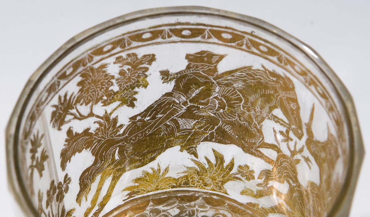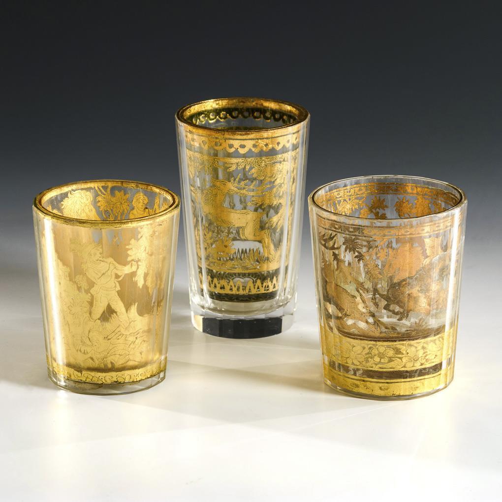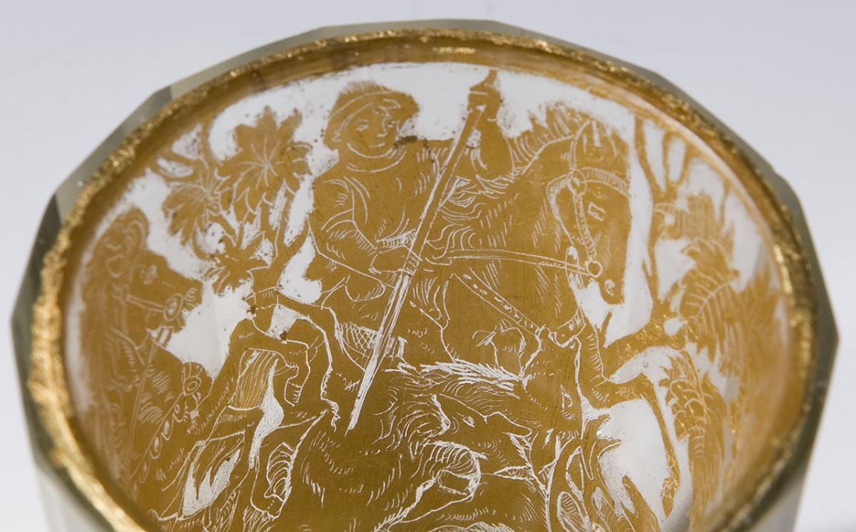 Colorless faceted glass. Circumferential and bottom etched gold foil. Between ornamental borders multi-figure deer hunting scenes in forest landscape. In the bottom a pair of ducks, a stag and a rosette. Conical wall, a flat ground. Two baroque cups with traces of age.
