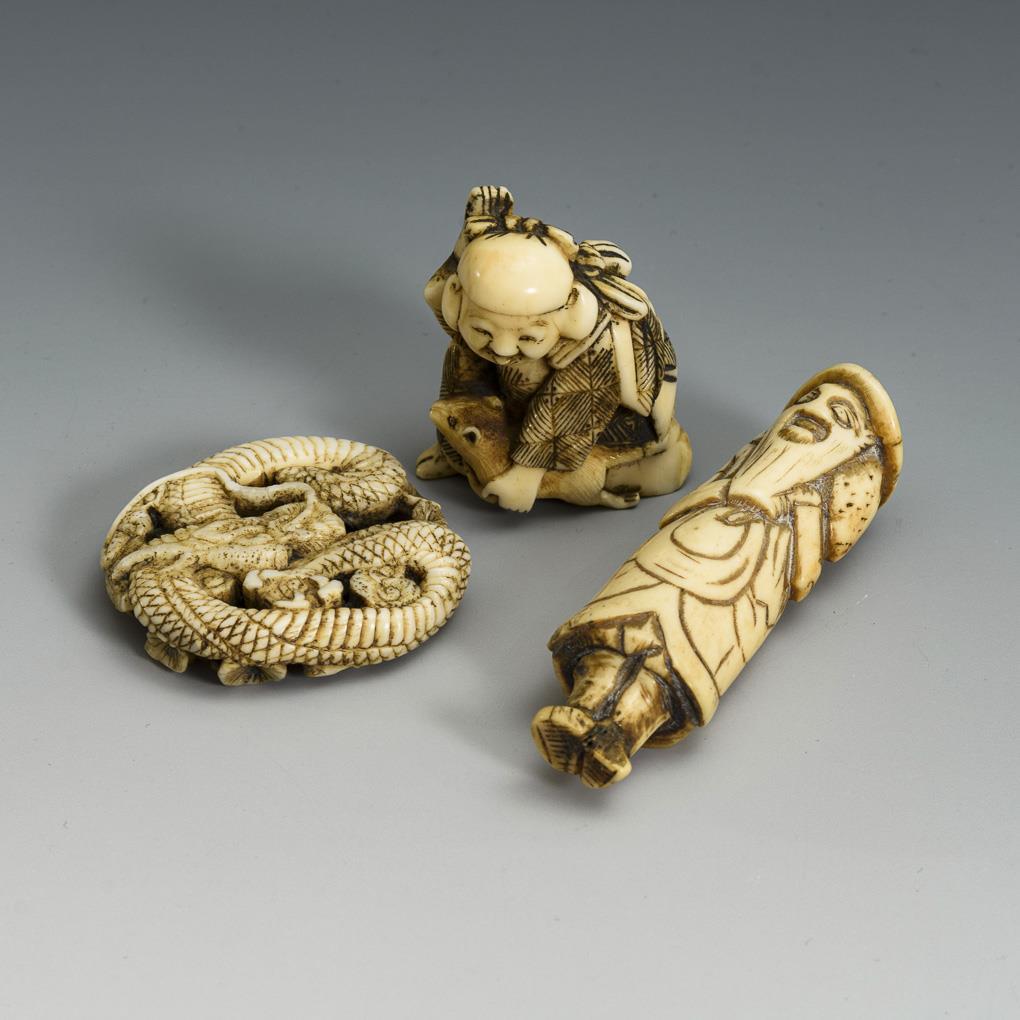 Standing figure with hat. / Squatting figure with rat. / Openwork disc with curled dragon, relieved on both sides.